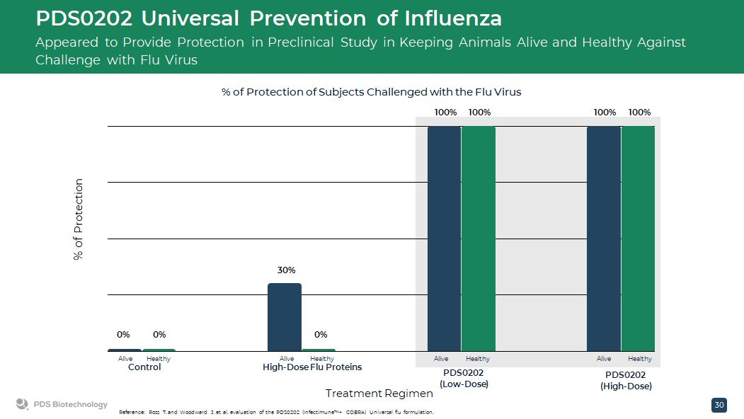 Reference: Ross T. and Woodward J. et al. evaluation of the PDS0202 (Infectimune™+ COBRA) Universal flu formulation.   PDS0202 Universal Prevention of Influenza   Appeared to Provide Protection in Preclinical Study in Keeping Animals Alive and Healthy Against Challenge with Flu Virus  Control  High-Dose Flu Proteins  PDS0202  (Low-Dose)  PDS0202  (High-Dose)  Alive  Healthy  Alive  Healthy  Alive  Healthy  Alive  Healthy  0%  0%  0%  30%  100%  100%  100%  100%  % of Protection  30  % of Protection of Subjects Challenged with the Flu Virus  Treatment Regimen