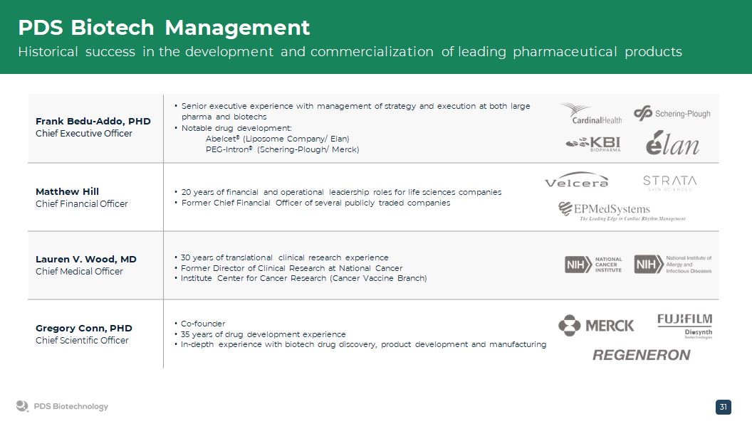 PDS Biotech Management  Historical success in the development and commercialization of leading pharmaceutical products  Timing  Safety data confirmed and released Q4 2021  Preliminary efficacy data anticipated Q1 2022  Frank Bedu-Addo, PHD  Chief Executive Officer  Senior executive experience with management of strategy and execution at both large pharma and biotechs  Notable drug development:   Abelcet® (Liposome Company/ Elan)   PEG-Intron® (Schering-Plough/ Merck)  Matthew Hill  Chief Financial Officer  20 years of financial and operational leadership roles for life sciences companies  Former Chief Financial Officer of several publicly traded companies  Lauren V. Wood, MD  Chief Medical Officer  30 years of translational clinical research experience  Former Director of Clinical Research at National Cancer  Institute Center for Cancer Research (Cancer Vaccine Branch)   Gregory Conn, PHD  Chief Scientific Officer  Co-founder  35 years of drug development experience   In-depth experience with biotech drug discovery, product development and manufacturing  31