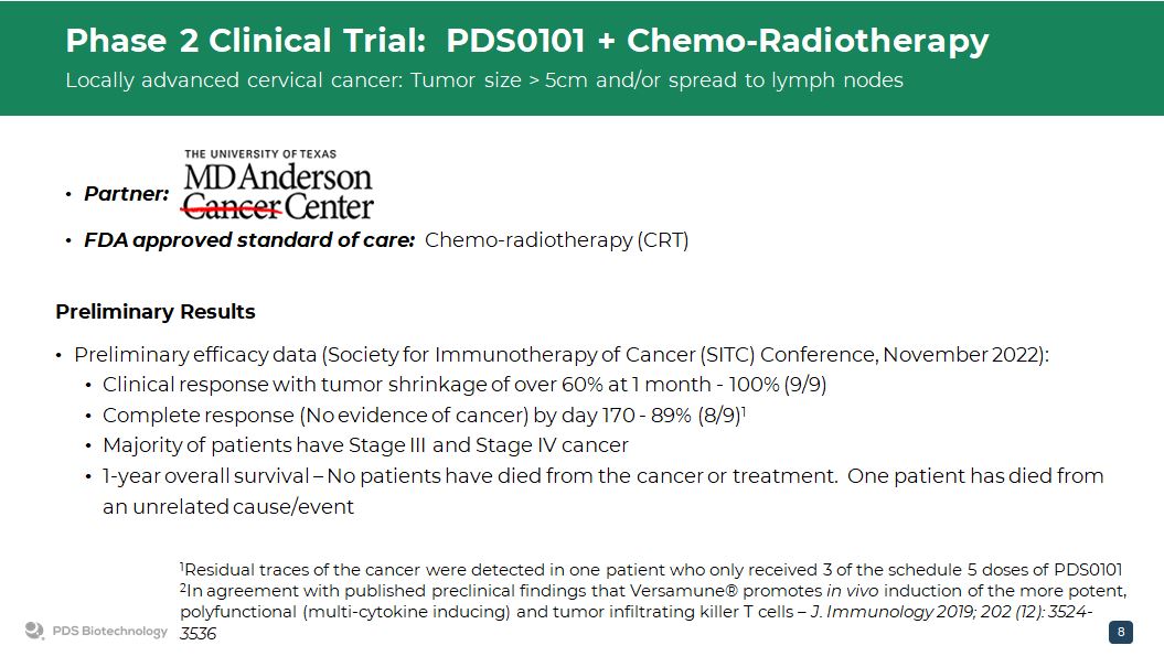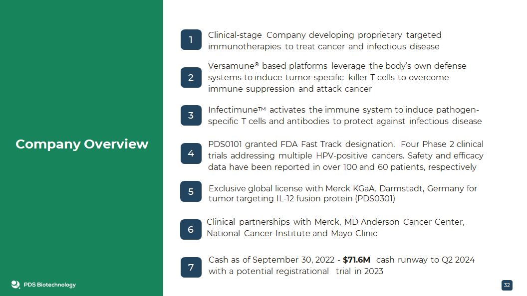 1  2  4  5  6  Company Overview  Clinical-stage Company developing proprietary targeted immunotherapies to treat cancer and infectious disease  Versamune® based platforms leverage the body’s own defense systems to induce tumor-specific killer T cells to overcome immune suppression and attack cancer  Exclusive global license with Merck KGaA, Darmstadt, Germany for tumor targeting IL-12 fusion protein (PDS0301)  Clinical partnerships with Merck, MD Anderson Cancer Center, National Cancer Institute and Mayo Clinic  Cash as of September 30, 2022 - $71.6M cash runway to Q2 2024 with a potential registrational trial in 2023  3  Infectimune™ activates the immune system to induce pathogen-specific T cells and antibodies to protect against infectious disease  32  PDS0101 granted FDA Fast Track designation. Four Phase 2 clinical trials addressing multiple HPV-positive cancers. Safety and efficacy data have been reported in over 100 and 60 patients, respectively  7