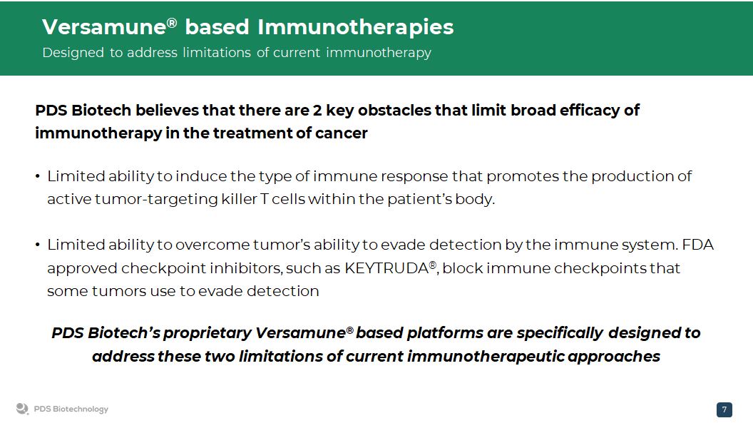 1  2  4  5  6  Company Overview  Clinical-stage Company developing proprietary targeted immunotherapies to treat cancer and infectious disease  Versamune® based platforms leverage the body’s own defense systems to induce tumor-specific killer T cells to overcome immune suppression and attack cancer  Exclusive global license with Merck KGaA, Darmstadt, Germany for tumor targeting IL-12 fusion protein (PDS0301)  Clinical partnerships with Merck, MD Anderson Cancer Center, National Cancer Institute and Mayo Clinic  Cash as of September 30, 2022 - $71.6M cash runway to Q2 2024 with a potential registrational trial in 2023  3  Infectimune™ activates the immune system to induce pathogen-specific T cells and antibodies to protect against infectious disease  3  PDS0101 granted FDA Fast Track designation. Four Phase 2 clinical trials addressing multiple HPV-positive cancers. Safety and efficacy data have been reported in over 100 and 60 patients, respectively  7