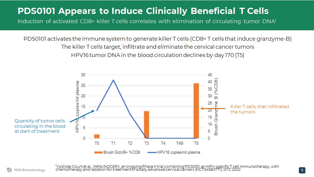 Induction of activated CD8+ killer T cells correlates with elimination of circulating tumor DNA1  PDS0101 Appears to Induce Clinically Beneficial T Cells   1Yoshida-Court et al,, IMMUNOCERV, an ongoing Phase II trial combining PDS0101, an HPV-specific T cell immunotherapy, with chemotherapy and radiation for treatment of locally advanced cervical cancers (NCT04580771); SITC 2022     9  PDS0101 activates the immune system to generate killer T cells (CD8+ T cells that induce granzyme-B)  The killer T cells target, infiltrate and eliminate the cervical cancer tumors  HPV16 tumor DNA in the blood circulation declines by day 170 (T5)  Quantity of tumor cells  circulating in the blood  at start of treatment  Killer T cells that infiltrated  the tumors