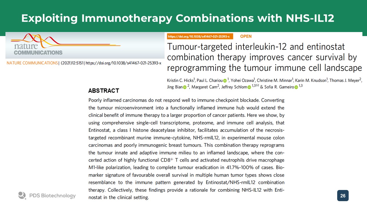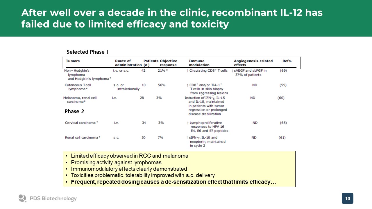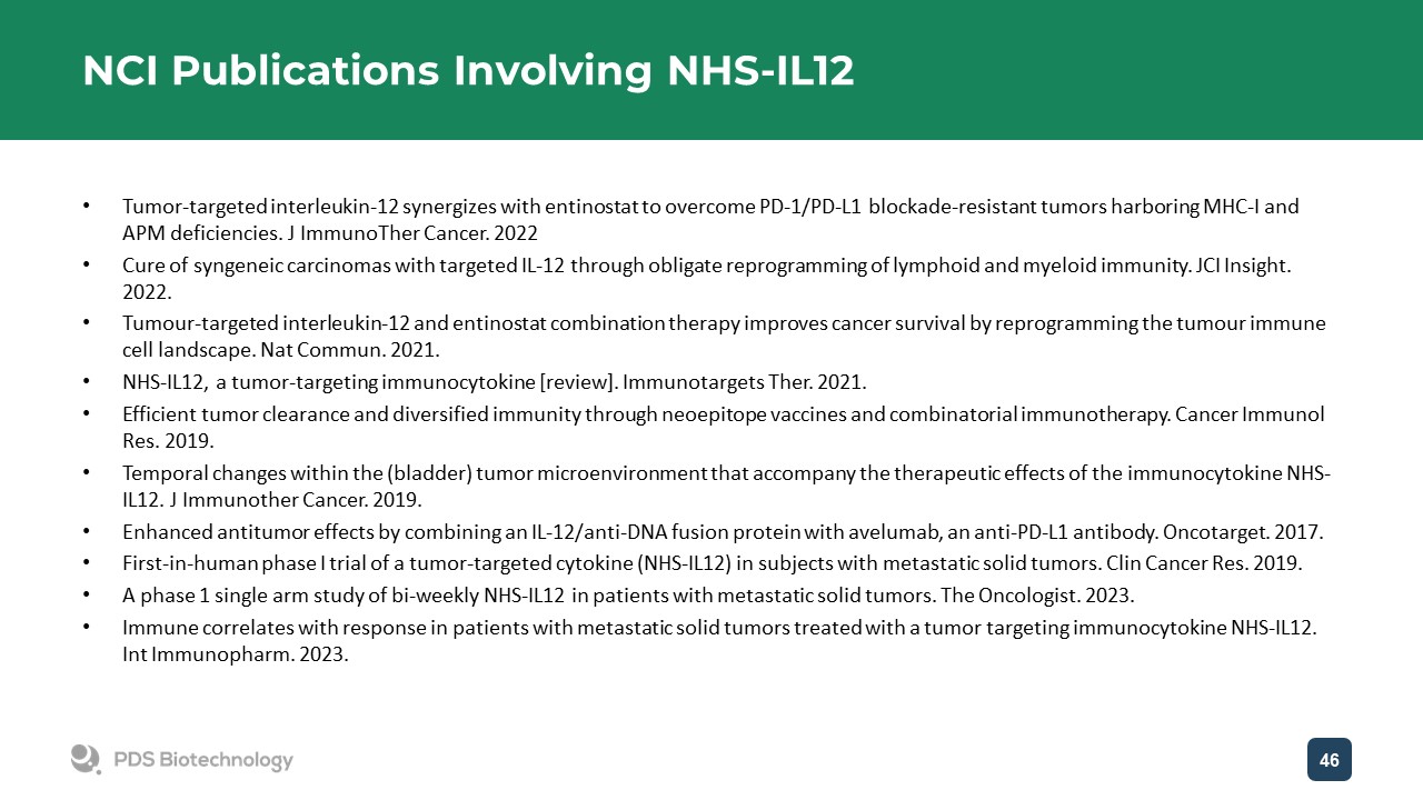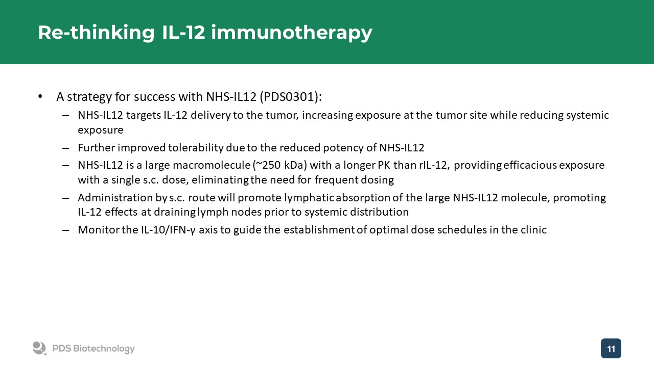 Re-thinking IL-12 immunotherapy  A strategy for success with NHS-IL12 (PDS0301):  NHS-IL12 targets IL-12 delivery to the tumor, increasing exposure at the tumor site while reducing systemic exposure  Further improved tolerability due to the reduced potency of NHS-IL12  NHS-IL12 is a large macromolecule (~250 kDa) with a longer PK than rIL-12, providing efficacious exposure with a single s.c. dose, eliminating the need for frequent dosing  Administration by s.c. route will promote lymphatic absorption of the large NHS-IL12 molecule, promoting IL-12 effects at draining lymph nodes prior to systemic distribution  Monitor the IL-10/IFN-γ axis to guide the establishment of optimal dose schedules in the clinic