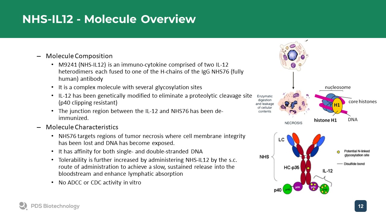 NHS-IL12 - Molecule Overview  Molecule Composition  M9241 (NHS-IL12) is an immuno-cytokine comprised of two IL-12 heterodimers each fused to one of the H-chains of the IgG NHS76 (fully human) antibody  It is a complex molecule with several glycosylation sites  IL-12 has been genetically modified to eliminate a proteolytic cleavage site (p40 clipping resistant)  The junction region between the IL-12 and NHS76 has been de-immunized.   Molecule Characteristics  NHS76 targets regions of tumor necrosis where cell membrane integrity has been lost and DNA has become exposed.   It has affinity for both single- and double-stranded DNA  Tolerability is further increased by administering NHS-IL12 by the s.c. route of administration to achieve a slow, sustained release into the bloodstream and enhance lymphatic absorption  No ADCC or CDC activity in vitro