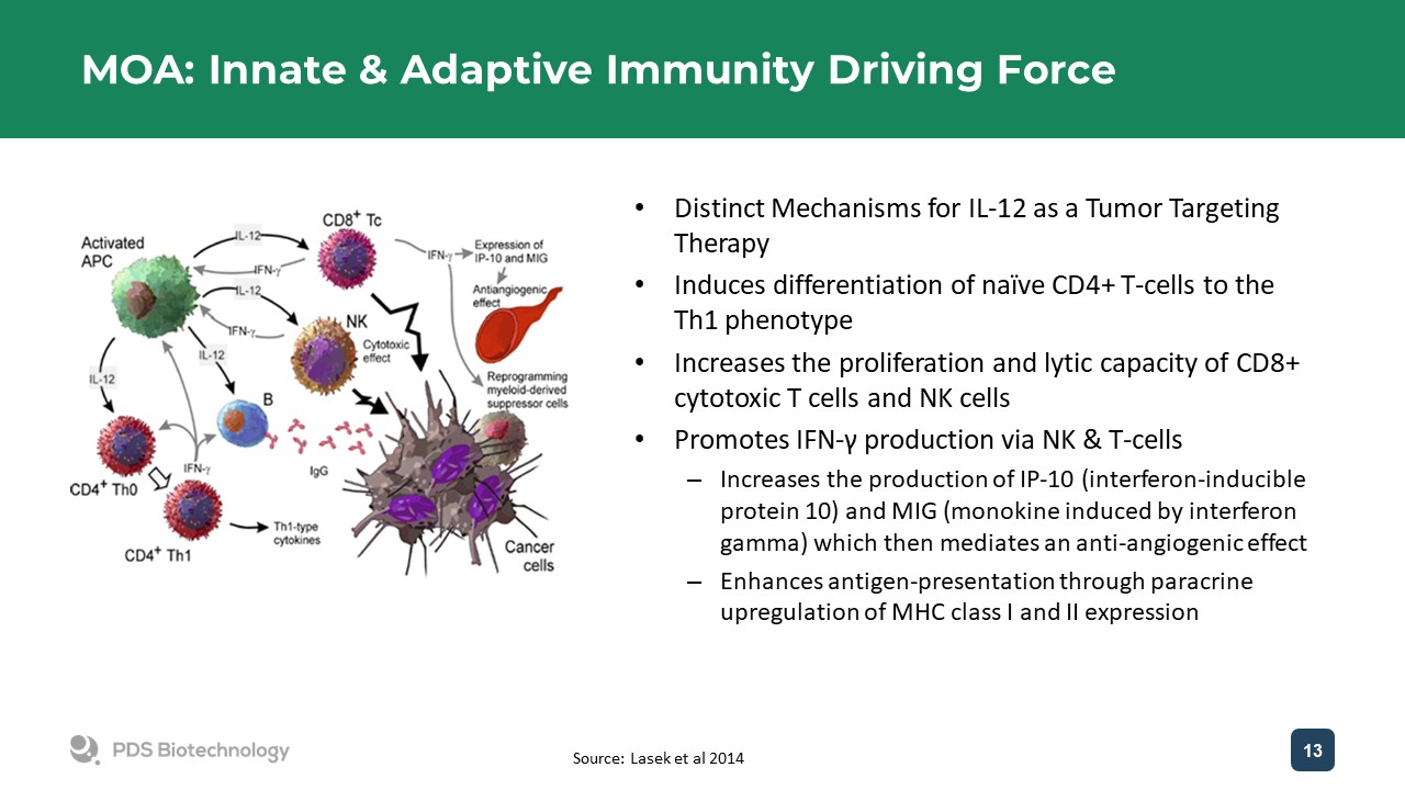 MOA: Innate & Adaptive Immunity Driving Force  Distinct Mechanisms for IL-12 as a Tumor Targeting Therapy  Induces differentiation of naïve CD4+ T-cells to the Th1 phenotype  Increases the proliferation and lytic capacity of CD8+ cytotoxic T cells and NK cells  Promotes IFN-γ production via NK & T-cells  Increases the production of IP-10 (interferon-inducible protein 10) and MIG (monokine induced by interferon gamma) which then mediates an anti-angiogenic effect  Enhances antigen-presentation through paracrine upregulation of MHC class I and II expression  Source: Lasek et al 2014