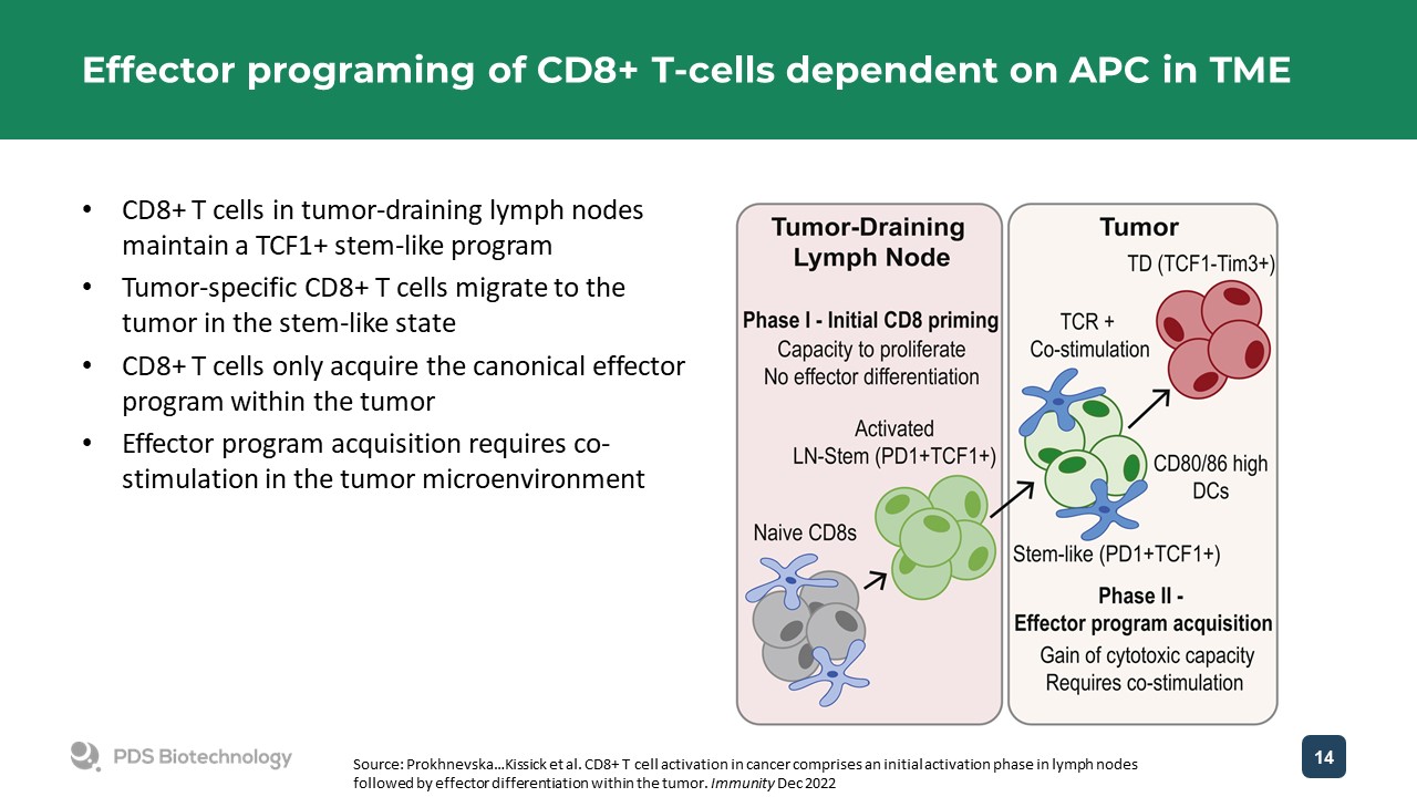 Effector programing of CD8+ T-cells dependent on APC in TME  CD8+ T cells in tumor-draining lymph nodes maintain a TCF1+ stem-like program  Tumor-specific CD8+ T cells migrate to the tumor in the stem-like state  CD8+ T cells only acquire the canonical effector program within the tumor  Effector program acquisition requires co-stimulation in the tumor microenvironment  Source: Prokhnevska…Kissick et al. CD8+ T cell activation in cancer comprises an initial activation phase in lymph nodes followed by effector differentiation within the tumor. Immunity Dec 2022