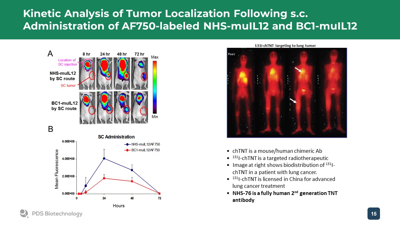 Kinetic Analysis of Tumor Localization Following s.c. Administration of AF750-labeled NHS-muIL12 and BC1-muIL12   15  chTNT is a mouse/human chimeric Ab  131I-chTNT is a targeted radiotherapeutic  Image at right shows biodistribution of 131I-chTNT in a patient with lung cancer.  131I-chTNT is licensed in China for advanced lung cancer treatment  NHS-76 is a fully human 2nd generation TNT antibody  131I-chTNT targeting to lung tumor