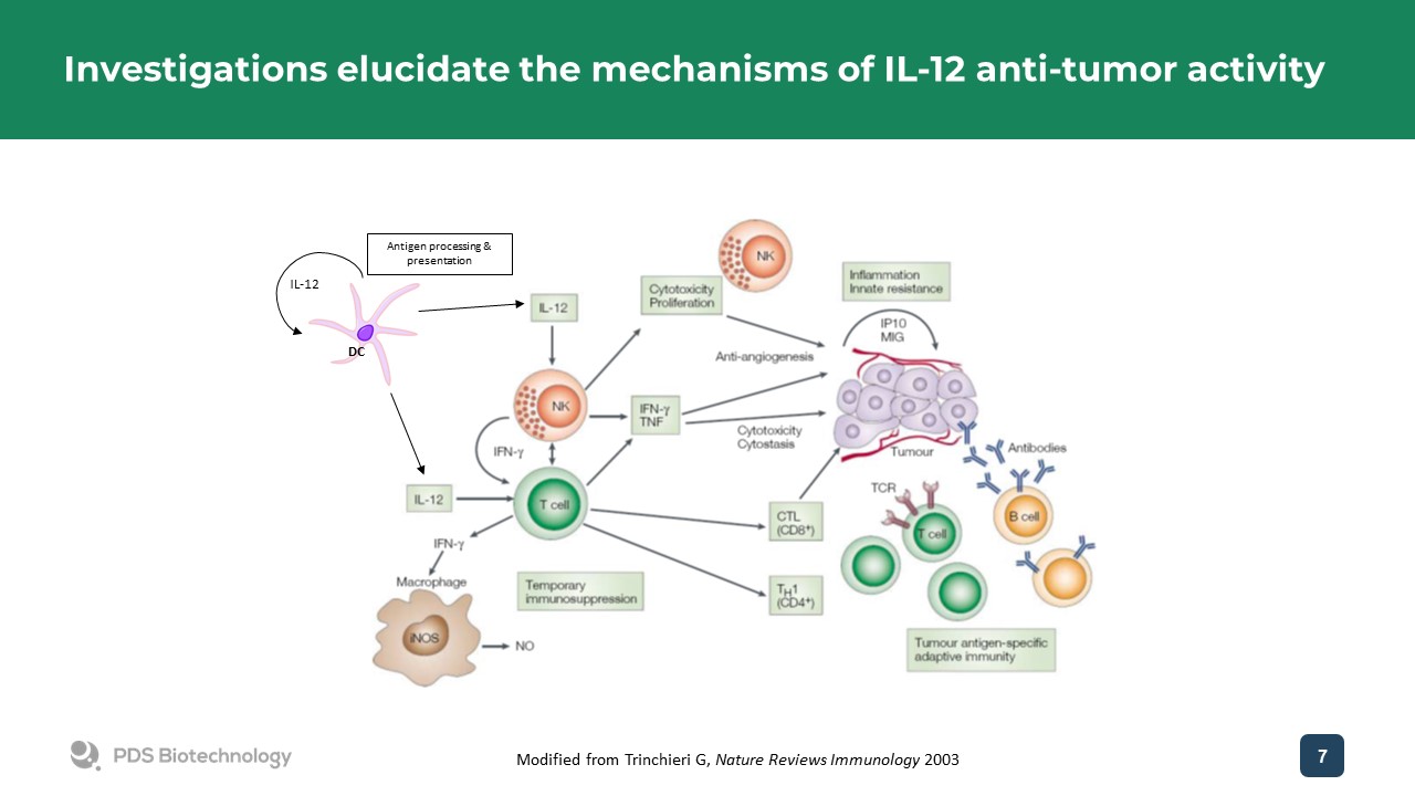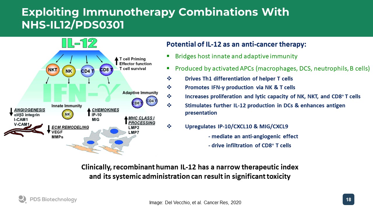 Potential of IL-12 as an anti-cancer therapy:  Bridges host innate and adaptive immunity  Produced by activated APCs (macrophages, DCS, neutrophils, B cells)  Drives Th1 differentiation of helper T cells  Promotes IFN-γ production via NK & T cells  Increases proliferation and lytic capacity of NK, NKT, and CD8+ T cells  Stimulates further IL-12 production in DCs & enhances antigen presentation  Upregulates IP-10/CXCL10 & MIG/CXCL9    - mediate an anti-angiogenic effect   - drive infiltration of CD8+ T cells  Clinically, recombinant human IL-12 has a narrow therapeutic index   and its systemic administration can result in significant toxicity  Image: Del Vecchio, et al. Cancer Res, 2020  Exploiting Immunotherapy Combinations With NHS-IL12/PDS0301