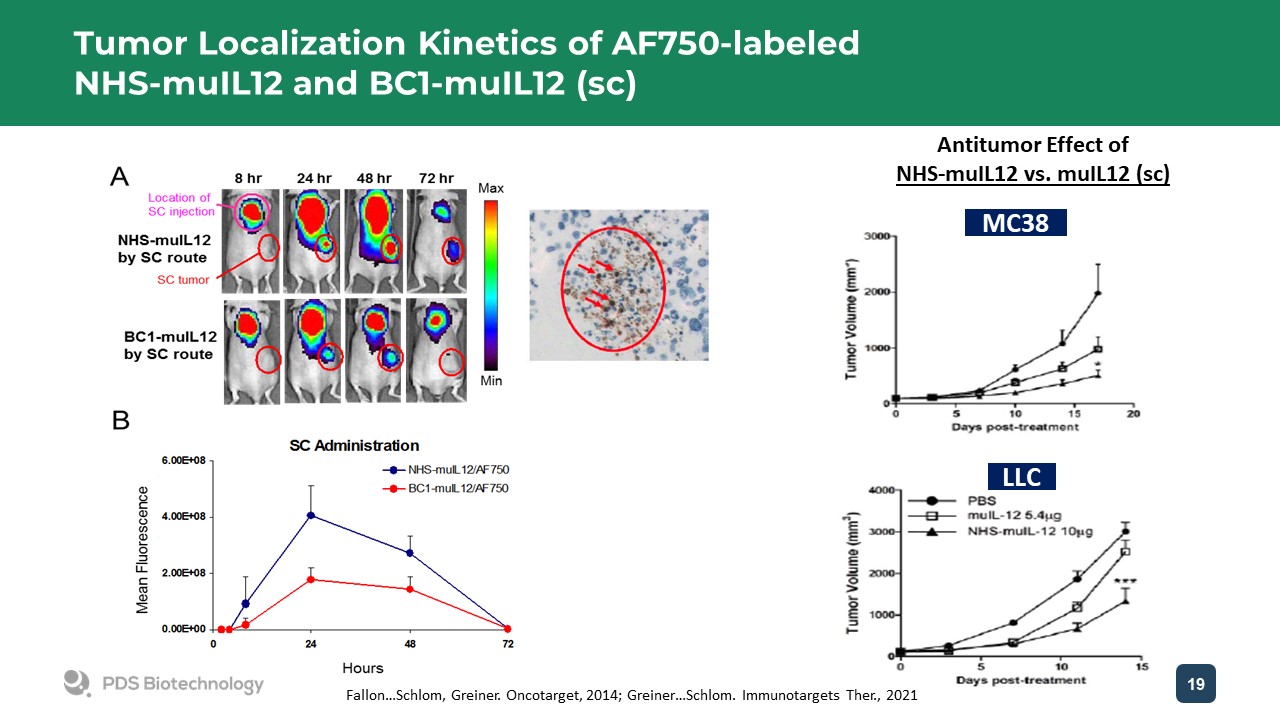 Tumor Localization Kinetics of AF750-labeledNHS-muIL12 and BC1-muIL12 (sc)   MC38  LLC  Antitumor Effect of   NHS-muIL12 vs. muIL12 (sc)   Fallon…Schlom, Greiner. Oncotarget, 2014; Greiner…Schlom. Immunotargets Ther., 2021