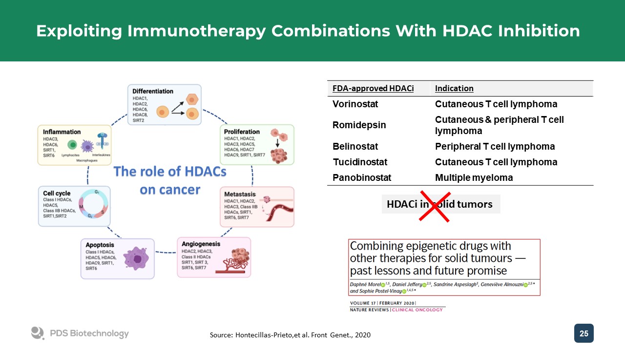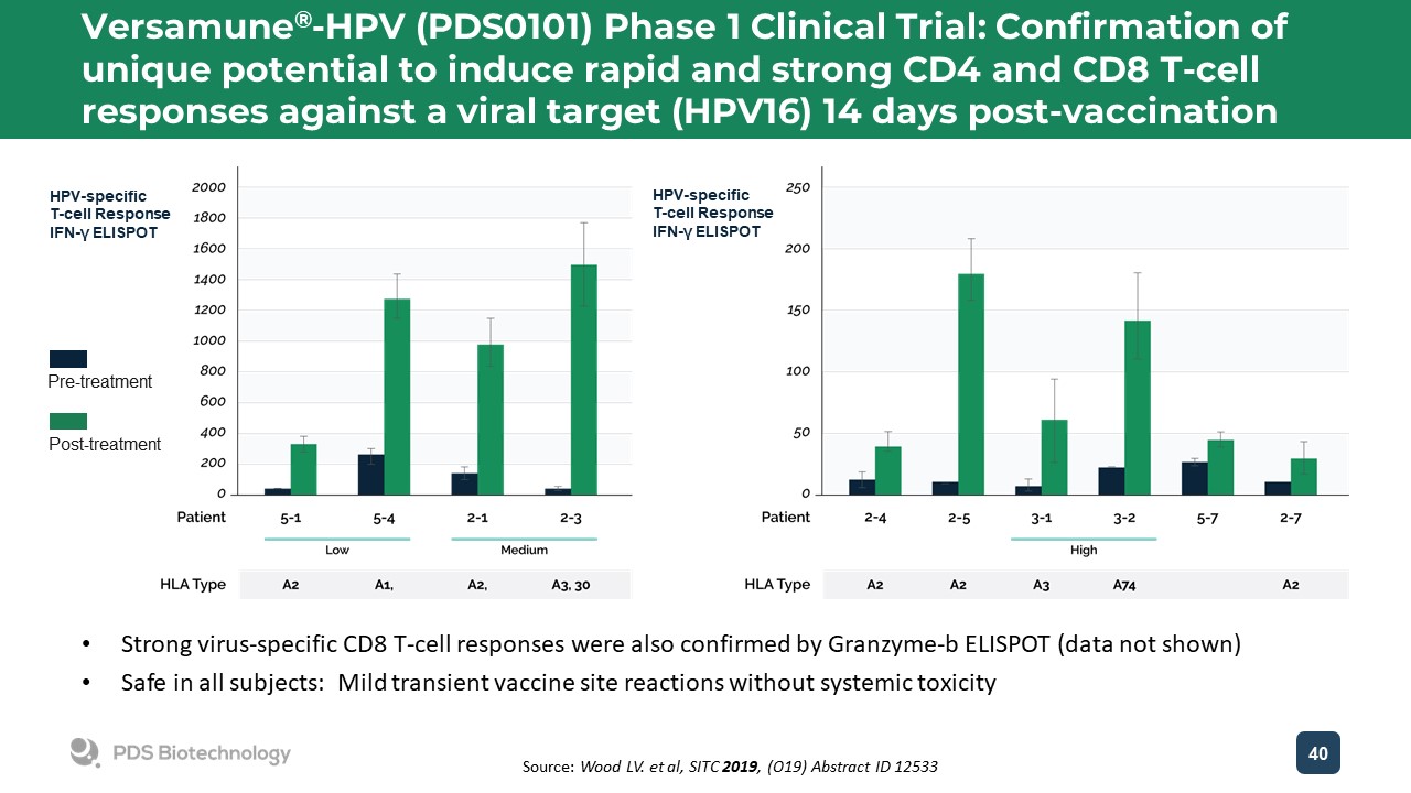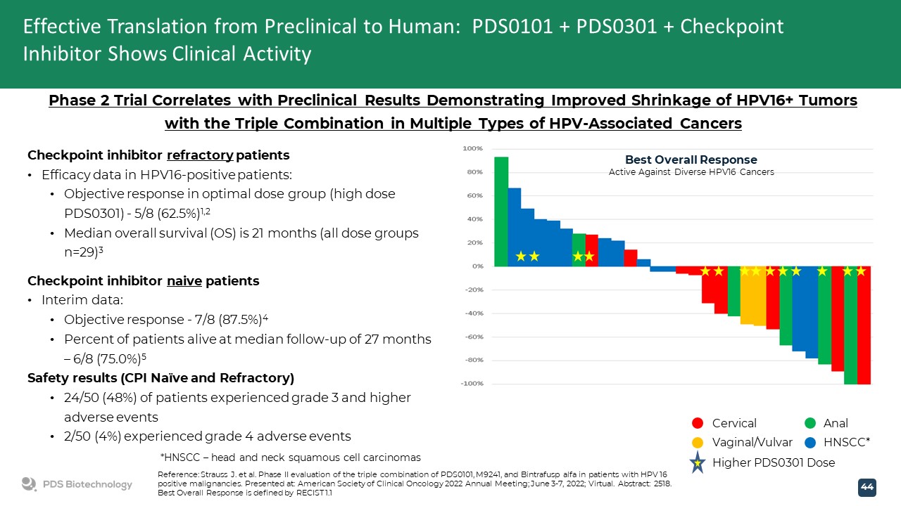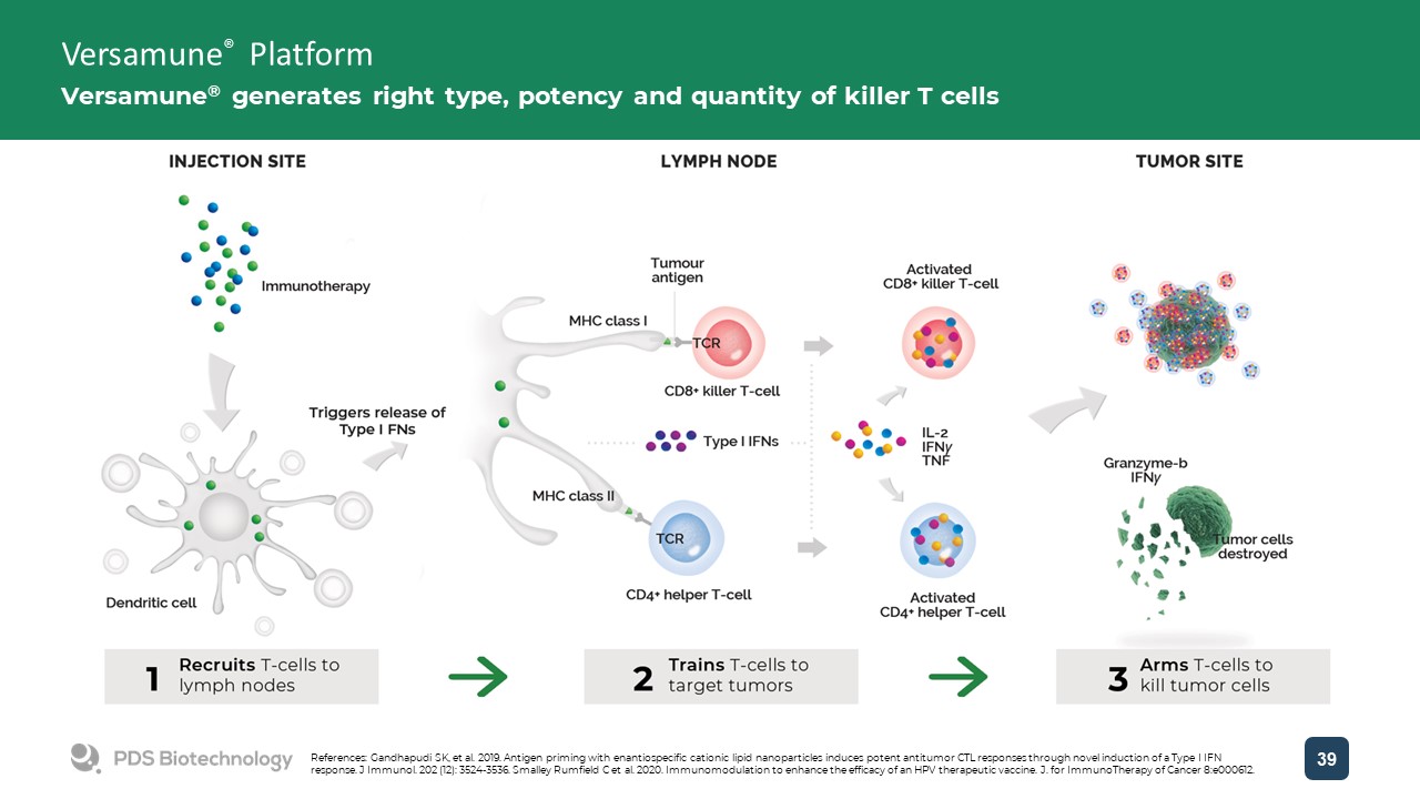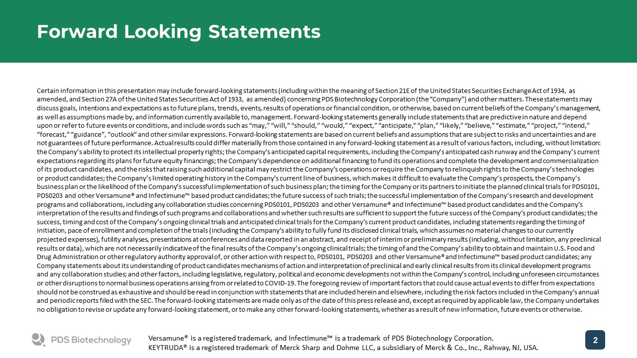 Forward Looking Statements  Certain information in this presentation may include forward-looking statements (including within the meaning of Section 21E of the United States Securities Exchange Act of 1934, as amended, and Section 27A of the United States Securities Act of 1933, as amended) concerning PDS Biotechnology Corporation (the “Company”) and other matters. These statements may discuss goals, intentions and expectations as to future plans, trends, events, results of operations or financial condition, or otherwise, based on current beliefs of the Company’s management, as well as assumptions made by, and information currently available to, management. Forward-looking statements generally include statements that are predictive in nature and depend upon or refer to future events or conditions, and include words such as “may,” “will,” “should,” “would,” “expect,” “anticipate,” “plan,” “likely,” “believe,” “estimate,” “project,” “intend,” “forecast,” “guidance”, “outlook” and other similar expressions. Forward-looking statements are based on current beliefs and assumptions that are subject to risks and uncertainties and are not guarantees of future performance. Actual results could differ materially from those contained in any forward-looking statement as a result of various factors, including, without limitation: the Company’s ability to protect its intellectual property rights; the Company’s anticipated capital requirements, including the Company’s anticipated cash runway and the Company’s current expectations regarding its plans for future equity financings; the Company’s dependence on additional financing to fund its operations and complete the development and commercialization of its product candidates, and the risks that raising such additional capital may restrict the Company’s operations or require the Company to relinquish rights to the Company’s technologies or product candidates; the Company’s limited operating history in the Company’s current line of business, which makes it difficult to evaluate the Company’s prospects, the Company’s business plan or the likelihood of the Company’s successful implementation of such business plan; the timing for the Company or its partners to initiate the planned clinical trials for PDS0101, PDS0203 and other Versamune® and Infectimune™ based product candidates; the future success of such trials; the successful implementation of the Company’s research and development programs and collaborations, including any collaboration studies concerning PDS0101, PDS0203 and other Versamune® and Infectimune™ based product candidates and the Company’s interpretation of the results and findings of such programs and collaborations and whether such results are sufficient to support the future success of the Company’s product candidates; the success, timing and cost of the Company’s ongoing clinical trials and anticipated clinical trials for the Company’s current product candidates, including statements regarding the timing of initiation, pace of enrollment and completion of the trials (including the Company’s ability to fully fund its disclosed clinical trials, which assumes no material changes to our currently projected expenses), futility analyses, presentations at conferences and data reported in an abstract, and receipt of interim or preliminary results (including, without limitation, any preclinical results or data), which are not necessarily indicative of the final results of the Company’s ongoing clinical trials; the timing of and the Company’s ability to obtain and maintain U.S. Food and Drug Administration or other regulatory authority approval of, or other action with respect to, PDS0101, PDS0203 and other Versamune® and Infectimune™ based product candidates; any Company statements about its understanding of product candidates mechanisms of action and interpretation of preclinical and early clinical results from its clinical development programs and any collaboration studies; and other factors, including legislative, regulatory, political and economic developments not within the Company’s control, including unforeseen circumstances or other disruptions to normal business operations arising from or related to COVID-19. The foregoing review of important factors that could cause actual events to differ from expectations should not be construed as exhaustive and should be read in conjunction with statements that are included herein and elsewhere, including the risk factors included in the Company’s annual and periodic reports filed with the SEC. The forward-looking statements are made only as of the date of this press release and, except as required by applicable law, the Company undertakes no obligation to revise or update any forward-looking statement, or to make any other forward-looking statements, whether as a result of new information, future events or otherwise.  Versamune® is a registered trademark, and Infectimune™ is a trademark of PDS Biotechnology Corporation.KEYTRUDA® is a registered trademark of Merck Sharp and Dohme LLC, a subsidiary of Merck & Co., Inc., Rahway, NJ, USA.