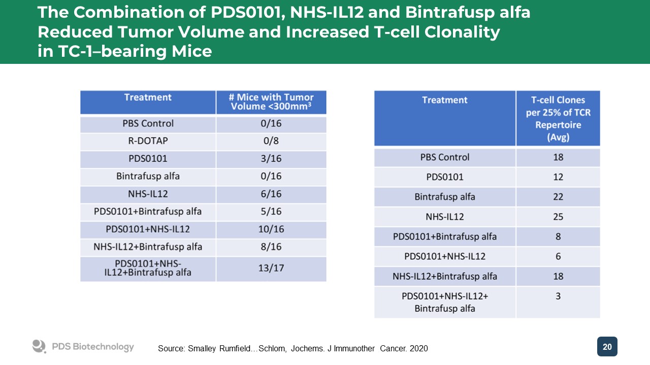 The Combination of PDS0101, NHS-IL12 and Bintrafusp alfa Reduced Tumor Volume and Increased T-cell Clonality in TC-1–bearing Mice  Source: Smalley Rumfield…Schlom, Jochems. J Immunother Cancer. 2020