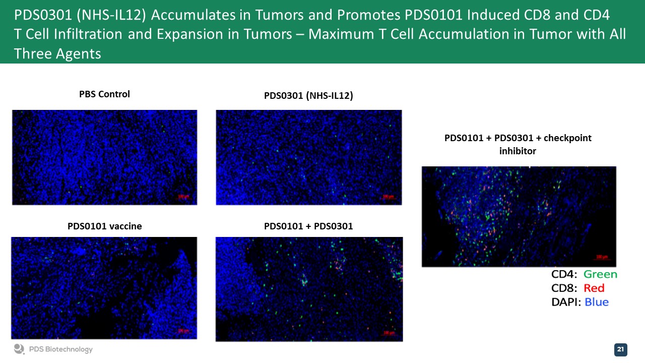 PDS0301 (NHS-IL12) Accumulates in Tumors and Promotes PDS0101 Induced CD8 and CD4   T Cell Infiltration and Expansion in Tumors – Maximum T Cell Accumulation in Tumor with All Three Agents  21  PBS Control  PDS0301 (NHS-IL12)  PDS0101 vaccine  PDS0101 + PDS0301  PDS0101 + PDS0301 + checkpoint inhibitor