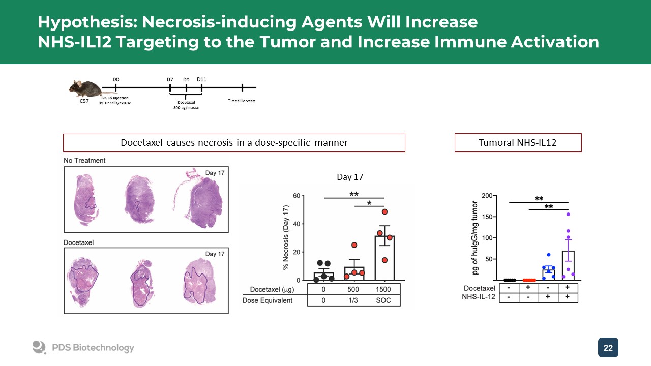 Hypothesis: Necrosis-inducing Agents Will Increase NHS-IL12 Targeting to the Tumor and Increase Immune Activation  Day 17  Docetaxel causes necrosis in a dose-specific manner  Tumoral NHS-IL12