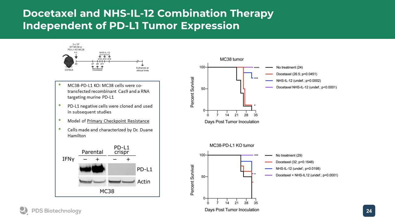 Docetaxel and NHS-IL-12 Combination Therapy Independent of PD-L1 Tumor Expression  MC38-PD-L1 KO: MC38 cells were co-transfected recombinant Cas9 and a RNA targeting murine PD-L1  PD-L1 negative cells were cloned and used in subsequent studies  Model of Primary Checkpoint Resistance   Cells made and characterized by Dr. Duane Hamilton