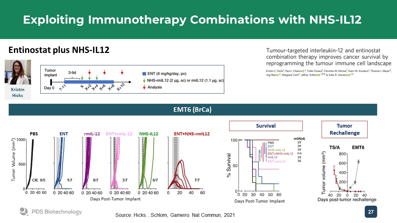 Days Post-Tumor Implant  Tumor Volume (mm3)  EMT6 (BrCa)  NHS-IL12  PBS  ENT  CR: 0/5  1/7  0/7  3/7  7/7  0/7  Days Post-Tumor Implant  Tumor Rechallenge  Survival  Kristin  Hicks  ENT+NHS-rmIL12  rmIL-12  ENT+rmIL-12  Entinostat plus NHS-IL12  Source: Hicks…Schlom, Gameiro. Nat Commun, 2021  Exploiting Immunotherapy Combinations with NHS-IL12