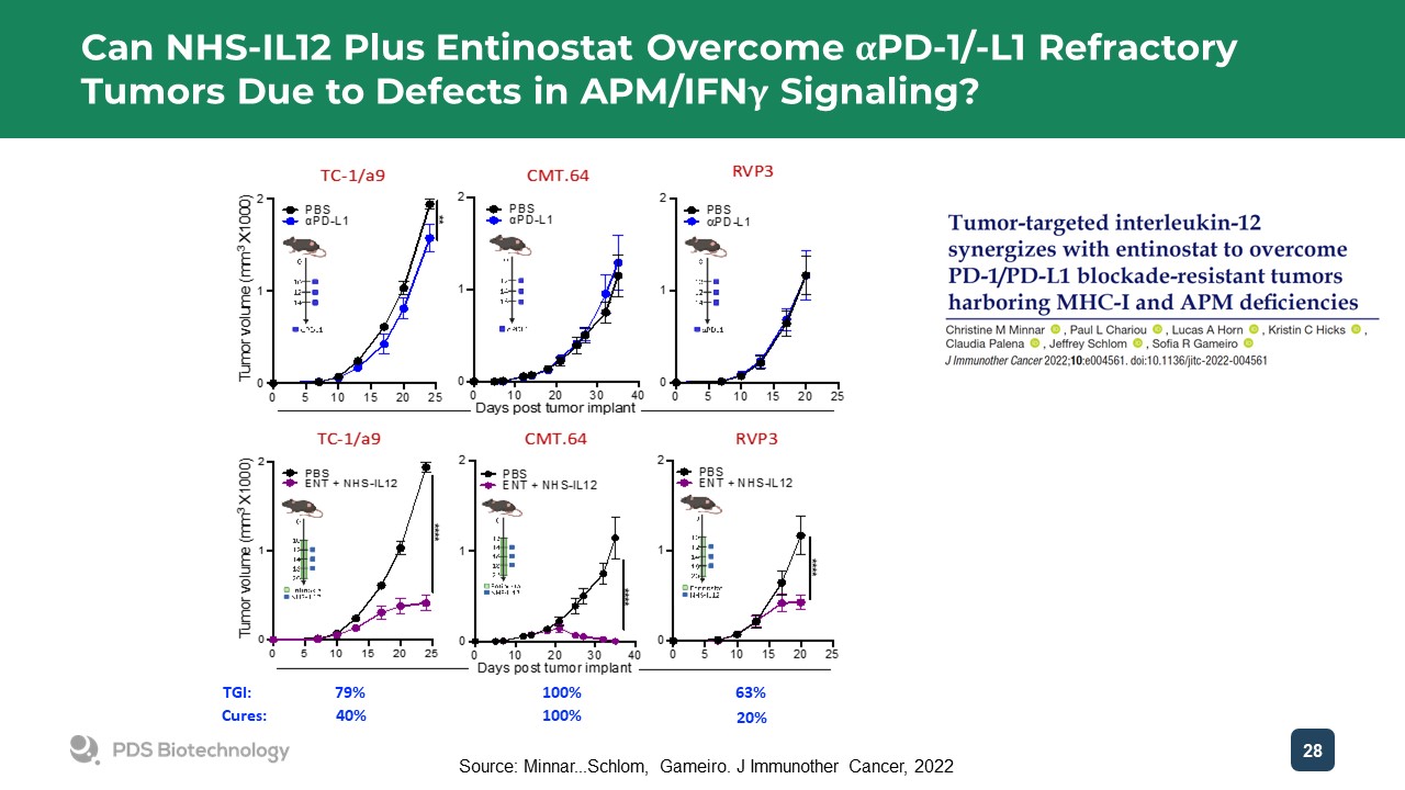 79%  TGI:  100%  63%  Cures: 40%  100%  20%  Can NHS-IL12 Plus Entinostat Overcome αPD-1/-L1 Refractory Tumors Due to Defects in APM/IFNγ Signaling?  Source: Minnar...Schlom, Gameiro. J Immunother Cancer, 2022