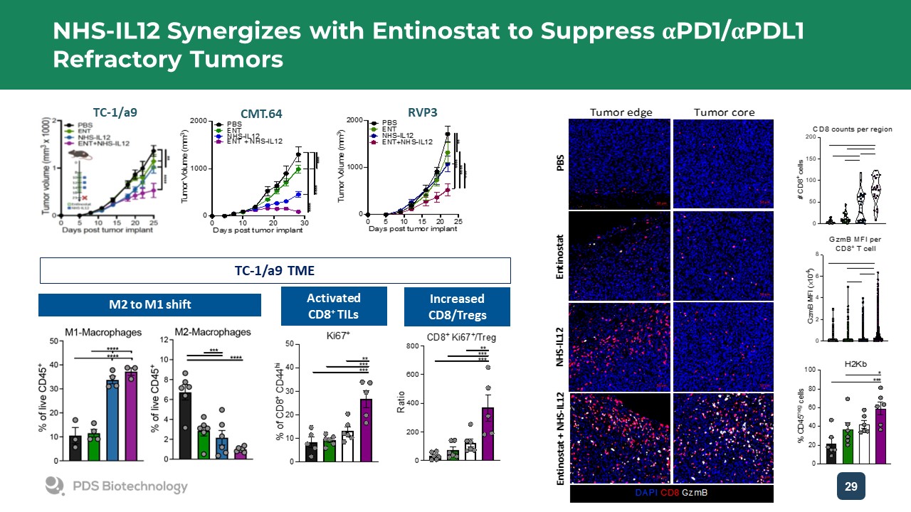 M2 to M1 shift  Activated  CD8+ TILs  Increased  CD8/Tregs  TC-1/a9  CMT.64  RVP3  TC-1/a9 TME  NHS-IL12 Synergizes with Entinostat to Suppress αPD1/αPDL1 Refractory Tumors