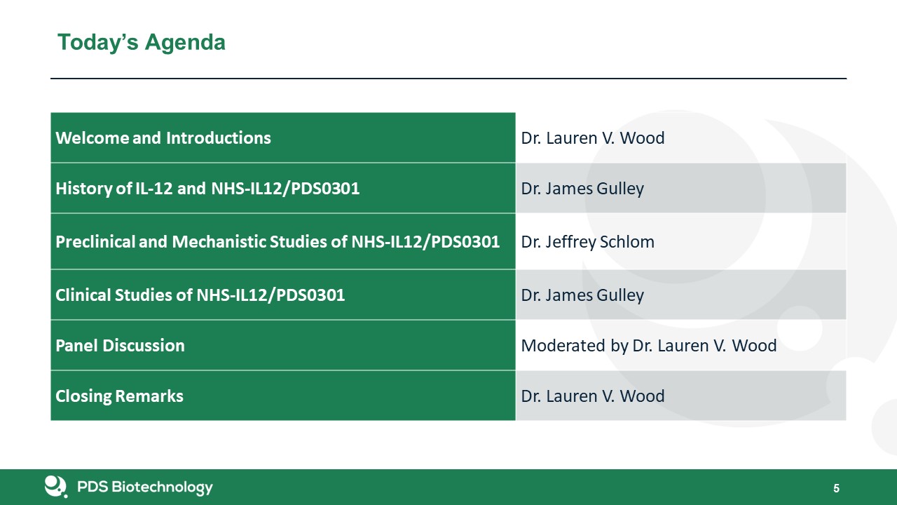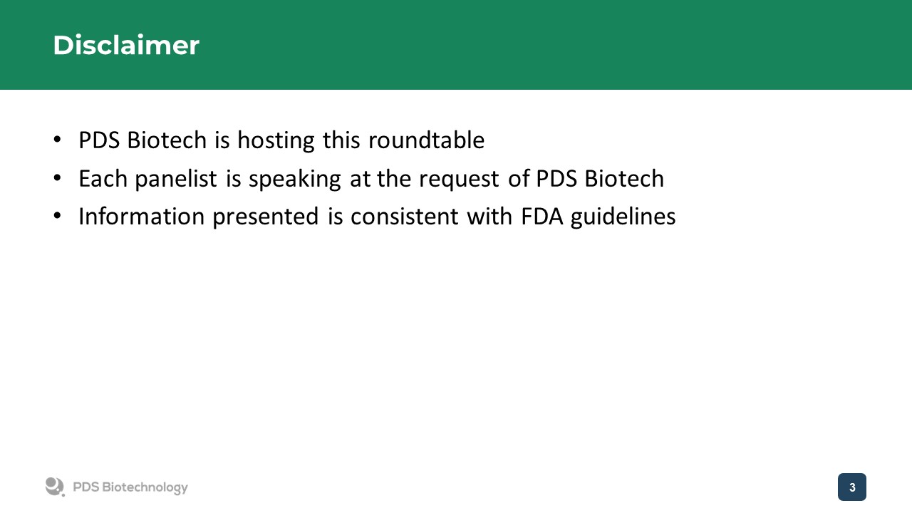 Disclaimer  PDS Biotech is hosting this roundtable  Each panelist is speaking at the request of PDS Biotech  Information presented is consistent with FDA guidelines