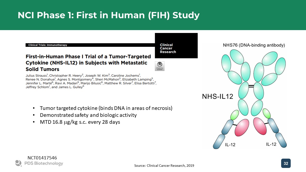 Source: Clinical Cancer Research, 2019  Tumor targeted cytokine (binds DNA in areas of necrosis)   Demonstrated safety and biologic activity  MTD 16.8 mg/kg s.c. every 28 days  NCI Phase 1: First in Human (FIH) Study  NCT01417546