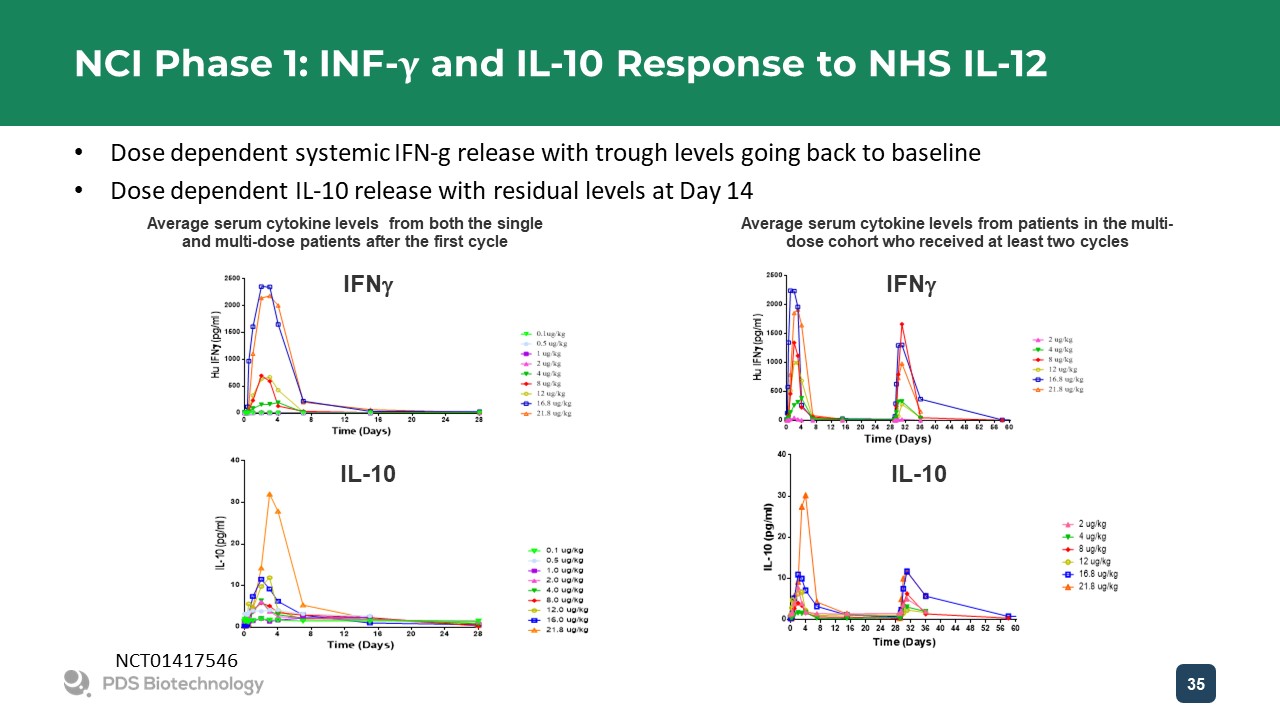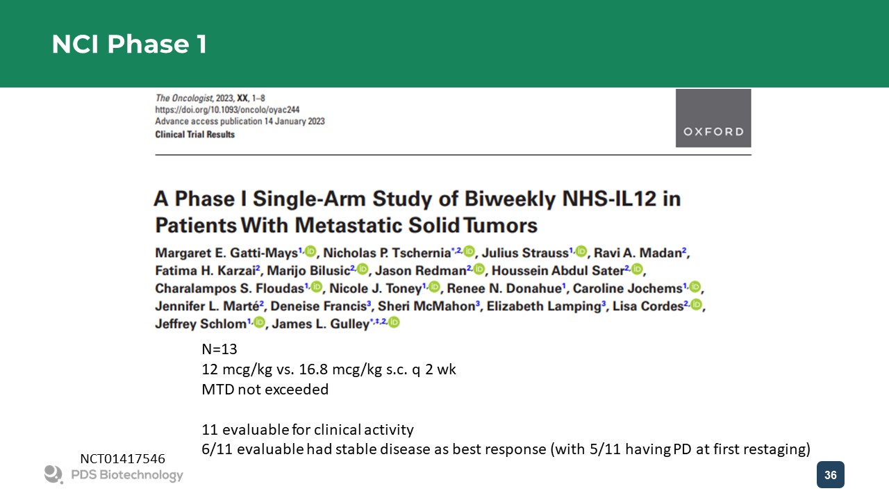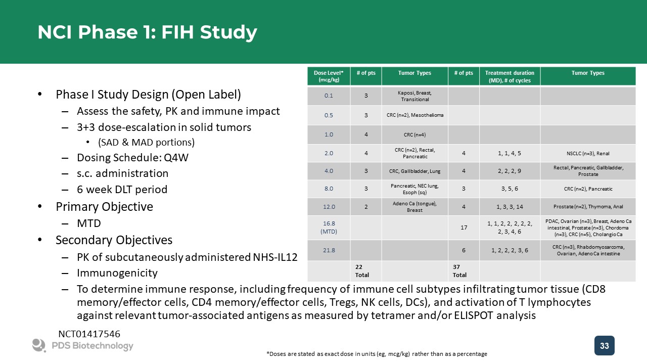 NCI Phase 1: FIH Study  Phase I Study Design (Open Label)  Assess the safety, PK and immune impact  3+3 dose-escalation in solid tumors   (SAD & MAD portions)  Dosing Schedule: Q4W  s.c. administration  6 week DLT period  Primary Objective  MTD  Secondary Objectives  PK of subcutaneously administered NHS-IL12  Immunogenicity   To determine immune response, including frequency of immune cell subtypes infiltrating tumor tissue (CD8 memory/effector cells, CD4 memory/effector cells, Tregs, NK cells, DCs), and activation of T lymphocytes against relevant tumor-associated antigens as measured by tetramer and/or ELISPOT analysis  Dose Level*  (mcg/kg)  # of pts  Tumor Types  # of pts  Treatment duration (MD), # of cycles  Tumor Types  0.1  3  Kaposi, Breast, Transitional  0.5  3  CRC (n=2), Mesothelioma  1.0  4  CRC (n=4)  2.0  4  CRC (n=2), Rectal, Pancreatic  4  1, 1, 4, 5  NSCLC (n=3), Renal  4.0  3  CRC, Gallbladder, Lung  4  2, 2, 2, 9  Rectal, Pancreatic, Gallbladder, Prostate  8.0  3  Pancreatic, NEC lung, Esoph (sq)  3  3, 5, 6  CRC (n=2), Pancreatic  12.0  2  Adeno Ca (tongue), Breast  4  1, 3, 3, 14  Prostate (n=2), Thymoma, Anal  16.8  (MTD)  17  1, 1, 2, 2, 2, 2, 2, 2, 3, 4, 6  PDAC, Ovarian (n=3), Breast, Adeno Ca intestinal, Prostate (n=3), Chordoma (n=3), CRC (n=5), Cholangio Ca  21.8  6  1, 2, 2, 2, 3, 6  CRC (n=3), Rhabdomyosarcoma, Ovarian, Adeno Ca intestine  22 Total  37 Total  *Doses are stated as exact dose in units (eg, mcg/kg) rather than as a percentage  NCT01417546