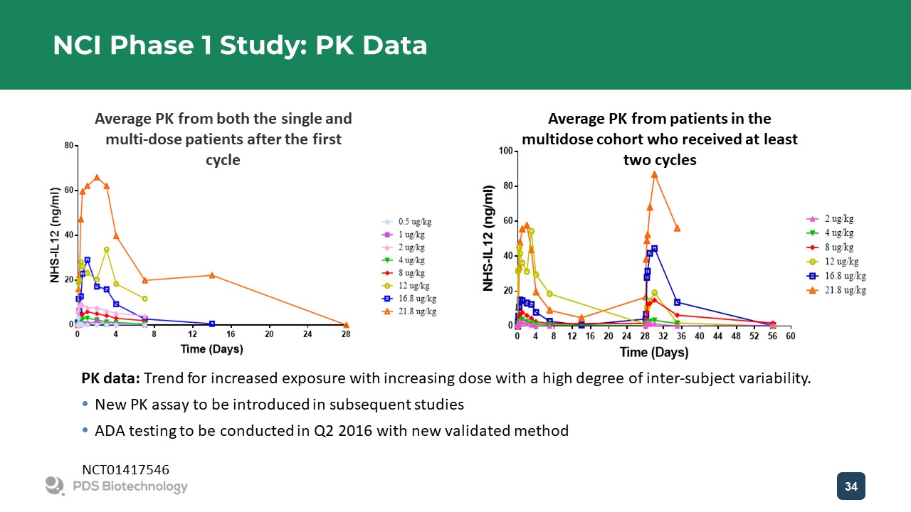 NCI Phase 1 Study: PK Data  Average PK from patients in the multidose cohort who received at least two cycles   Average PK from both the single and multi-dose patients after the first cycle   PK data: Trend for increased exposure with increasing dose with a high degree of inter-subject variability.   New PK assay to be introduced in subsequent studies  ADA testing to be conducted in Q2 2016 with new validated method  NCT01417546