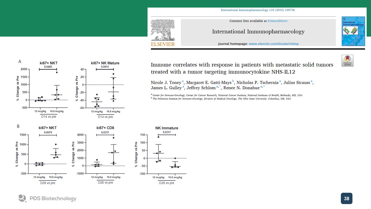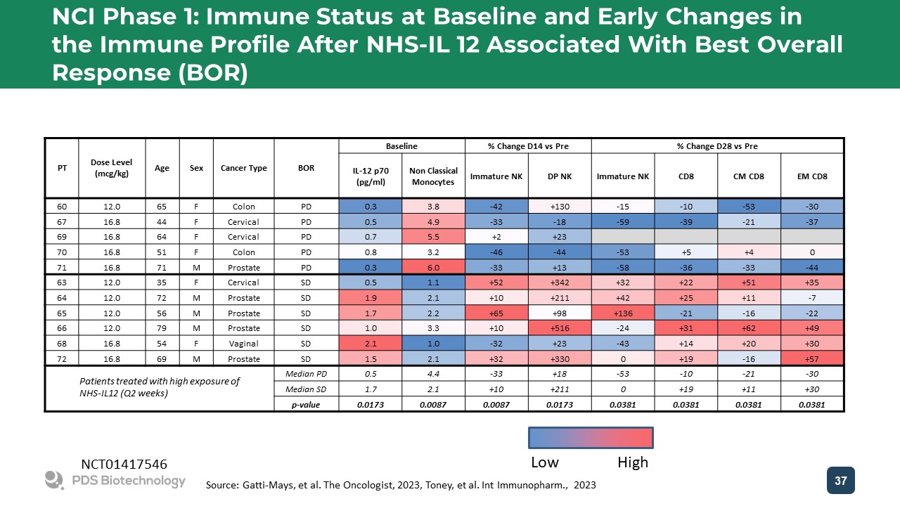 PT  Dose Level (mcg/kg)  Age  Sex  Cancer Type  BOR  Baseline  % Change D14 vs Pre  % Change D28 vs Pre  IL-12 p70 (pg/ml)  Non Classical Monocytes  Immature NK  DP NK  Immature NK  CD8  CM CD8  EM CD8  60  12.0  65  F  Colon  PD  0.3  3.8  -42  +130  -15  -10  -53  -30  67  16.8  44  F  Cervical  PD  0.5  4.9  -33  -18  -59  -39  -21  -37  69  16.8  64  F  Cervical  PD  0.7  5.5  +2  +23              70  16.8  51  F  Colon  PD  0.8  3.2  -46  -44  -53  +5  +4  0  71  16.8  71  M  Prostate  PD  0.3  6.0  -33  +13  -58  -36  -33  -44  63  12.0  35  F  Cervical  SD  0.5  1.1  +52  +342  +32  +22  +51  +35  64  12.0  72  M  Prostate  SD  1.9  2.1  +10  +211  +42  +25  +11  -7  65  12.0  56  M  Prostate  SD  1.7  2.2  +65  +98  +136  -21  -16  -22  66  12.0  79  M  Prostate  SD  1.0  3.3  +10  +516  -24  +31  +62  +49  68  16.8  54  F  Vaginal  SD  2.1  1.0  -32  +23  -43  +14  +20  +30  72  16.8  69  M  Prostate  SD  1.5  2.1  +32  +330  0  +19  -16  +57  Median PD  0.5  4.4  -33  +18  -53  -10  -21  -30  Median SD  1.7  2.1  +10  +211  0  +19  +11  +30  p-value  0.0173  0.0087  0.0087  0.0173  0.0381  0.0381  0.0381  0.0381  Patients treated with high exposure of NHS-IL12 (Q2 weeks)  NCI Phase 1: Immune Status at Baseline and Early Changes in the Immune Profile After NHS-IL 12 Associated With Best Overall Response (BOR)  Source: Gatti-Mays, et al. The Oncologist, 2023, Toney, et al. Int Immunopharm., 2023   NCT01417546  Low High