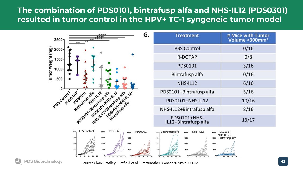 The combination of PDS0101, bintrafusp alfa and NHS-IL12 (PDS0301) resulted in tumor control in the HPV+ TC-1 syngeneic tumor model  Source: Claire Smalley Rumfield et al. J Immunother Cancer 2020;8:e000612