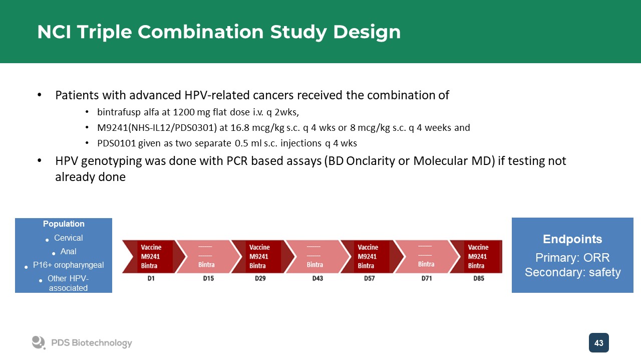 NCI Triple Combination Study Design  Patients with advanced HPV-related cancers received the combination of   bintrafusp alfa at 1200 mg flat dose i.v. q 2wks,   M9241(NHS-IL12/PDS0301) at 16.8 mcg/kg s.c. q 4 wks or 8 mcg/kg s.c. q 4 weeks and   PDS0101 given as two separate 0.5 ml s.c. injections q 4 wks   HPV genotyping was done with PCR based assays (BD Onclarity or Molecular MD) if testing not already done     Population  Cervical  Anal  P16+ oropharyngeal  Other HPV-associated   Endpoints  Primary: ORRSecondary: safety  Treatment until confirmed progression, unacceptable toxicity, or any criteria for withdrawal; treatment past progression was allowed   43
