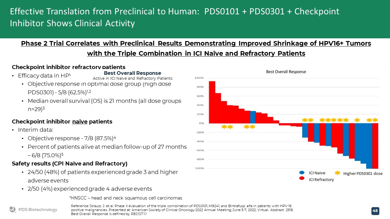 Best Overall Response  Active Against Diverse HPV16 Cancers   Effective Translation from Preclinical to Human: PDS0101 + PDS0301 + Checkpoint Inhibitor Shows Clinical Activity  44  *HNSCC – head and neck squamous cell carcinomas  Higher PDS0301 Dose  Cervical  Vaginal/Vulvar  Anal  HNSCC*  Reference: Strauss J. et al. Phase II evaluation of the triple combination of PDS0101, M9241, and Bintrafusp alfa in patients with HPV 16 positive malignancies. Presented at: American Society of Clinical Oncology 2022 Annual Meeting; June 3-7, 2022; Virtual. Abstract: 2518.   Best Overall Response is defined by RECIST 1.1  Checkpoint inhibitor refractory patients  Efficacy data in HPV16-positive patients:   Objective response in optimal dose group (high dose PDS0301) - 5/8 (62.5%)1,2  Median overall survival (OS) is 21 months (all dose groups n=29)3  Checkpoint inhibitor naive patients  Interim data:   Objective response - 7/8 (87.5%)4  Percent of patients alive at median follow-up of 27 months – 6/8 (75.0%)5  Safety results (CPI Naïve and Refractory)  24/50 (48%) of patients experienced grade 3 and higher adverse events  2/50 (4%) experienced grade 4 adverse events  Phase 2 Trial Correlates with Preclinical Results Demonstrating Improved Shrinkage of HPV16+ Tumors with the Triple Combination in Multiple Types of HPV-Associated Cancers