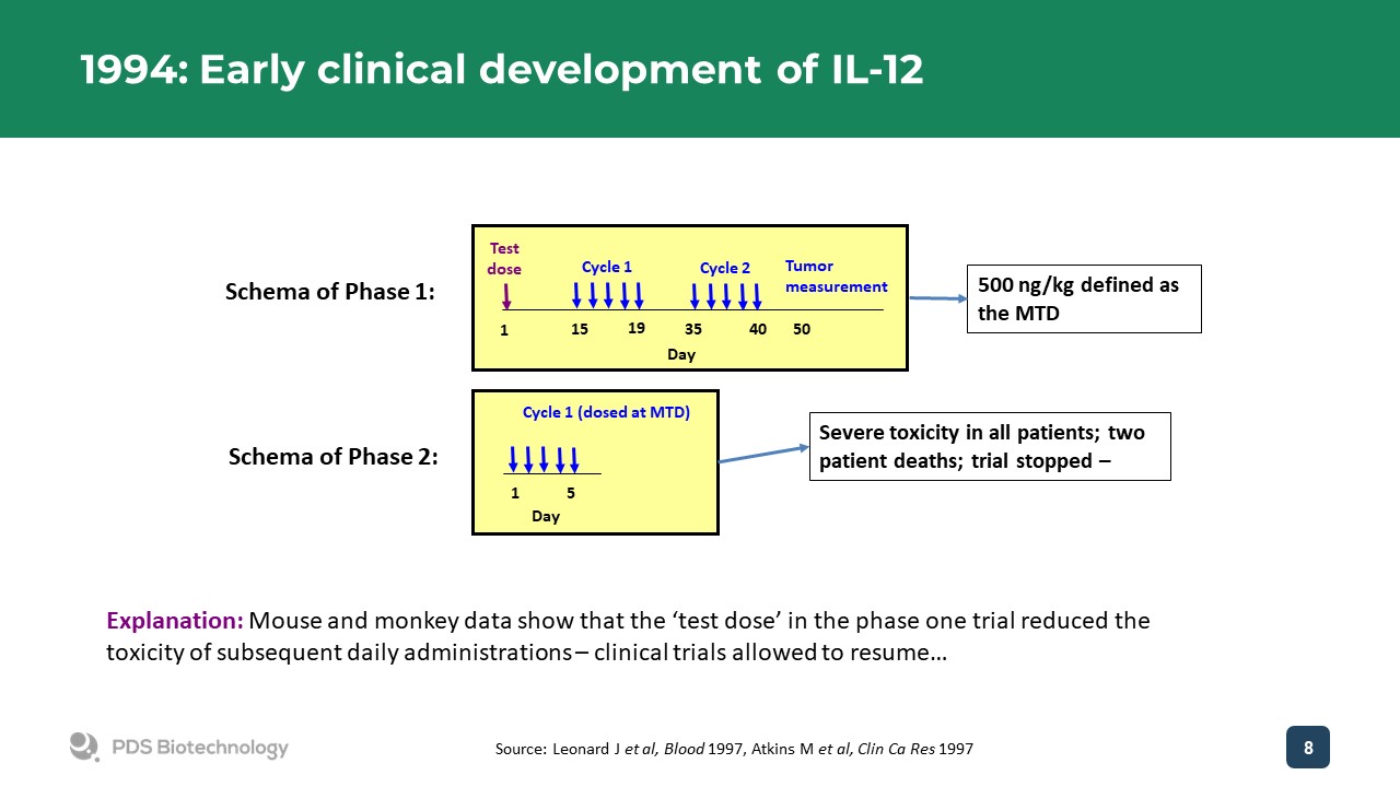 1994: Early clinical development of IL-12  Day  1  Test dose  15  Cycle 1  19  35  Cycle 2  40  Tumor measurement  50  Schema of Phase 1:  Day  1  Cycle 1 (dosed at MTD)  5  Schema of Phase 2:  500 ng/kg defined as the MTD  Explanation: Mouse and monkey data show that the ‘test dose’ in the phase one trial reduced the toxicity of subsequent daily administrations – clinical trials allowed to resume…  Severe toxicity in all patients; two patient deaths; trial stopped –   Source: Leonard J et al, Blood 1997, Atkins M et al, Clin Ca Res 1997