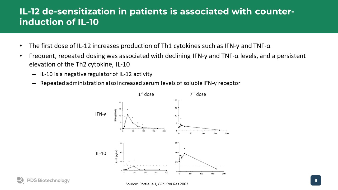 IL-12 de-sensitization in patients is associated with counter-induction of IL-10  The first dose of IL-12 increases production of Th1 cytokines such as IFN-γ and TNF-α  Frequent, repeated dosing was associated with declining IFN-γ and TNF-α levels, and a persistent elevation of the Th2 cytokine, IL-10  IL-10 is a negative regulator of IL-12 activity  Repeated administration also increased serum levels of soluble IFN-γ receptor  IL-10  1st dose  7th dose  IFN-γ  Source: Portielje J, Clin Can Res 2003