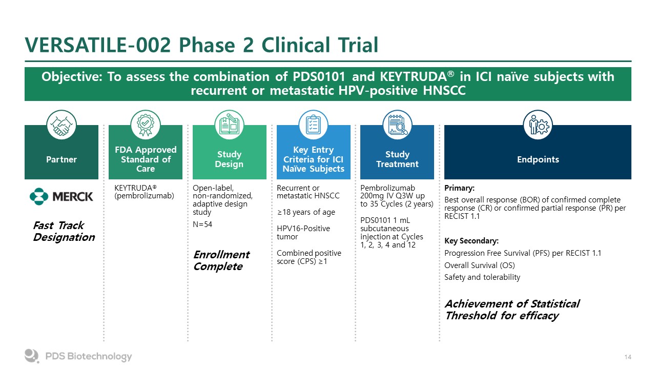 VERSATILE-002 Phase 2 Clinical Trial  Objective: To assess the combination of PDS0101 and KEYTRUDA® in ICI naïve subjects with recurrent or metastatic HPV-positive HNSCC  KEYTRUDA® (pembrolizumab)  FDA Approved Standard of Care  Partner  Study Design  Open-label, non-randomized, adaptive design study  N=54  Enrollment Complete   Key Entry Criteria for ICI Naïve Subjects  Recurrent or metastatic HNSCC   ≥18 years of age  HPV16-Positive tumor  Combined positive score (CPS) ≥1  Pembrolizumab 200mg IV Q3W up to 35 Cycles (2 years)  PDS0101 1 mL subcutaneous injection at Cycles 1, 2, 3, 4 and 12  Study Treatment  Primary:  Best overall response (BOR) of confirmed complete response (CR) or confirmed partial response (PR) per RECIST 1.1  Key Secondary:  Progression Free Survival (PFS) per RECIST 1.1  Overall Survival (OS)  Safety and tolerability  Achievement of Statistical Threshold for efficacy  Endpoints  Fast TrackDesignation