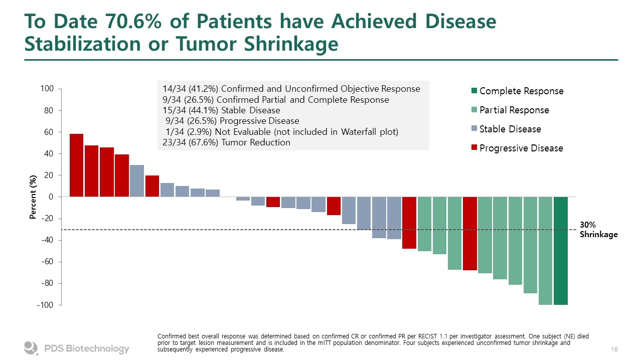 To Date 70.6% of Patients have Achieved Disease Stabilization or Tumor Shrinkage  Confirmed best overall response was determined based on confirmed CR or confirmed PR per RECIST 1.1 per investigator assessment. One subject (NE) died prior to target lesion measurement and is included in the mITT population denominator. Four subjects experienced unconfirmed tumor shrinkage and subsequently experienced progressive disease.   30%Shrinkage  14/34 (41.2%) Confirmed and Unconfirmed Objective Response  9/34 (26.5%) Confirmed Partial and Complete Response  15/34 (44.1%) Stable Disease   9/34 (26.5%) Progressive Disease   1/34 (2.9%) Not Evaluable (not included in Waterfall plot)  23/34 (67.6%) Tumor Reduction