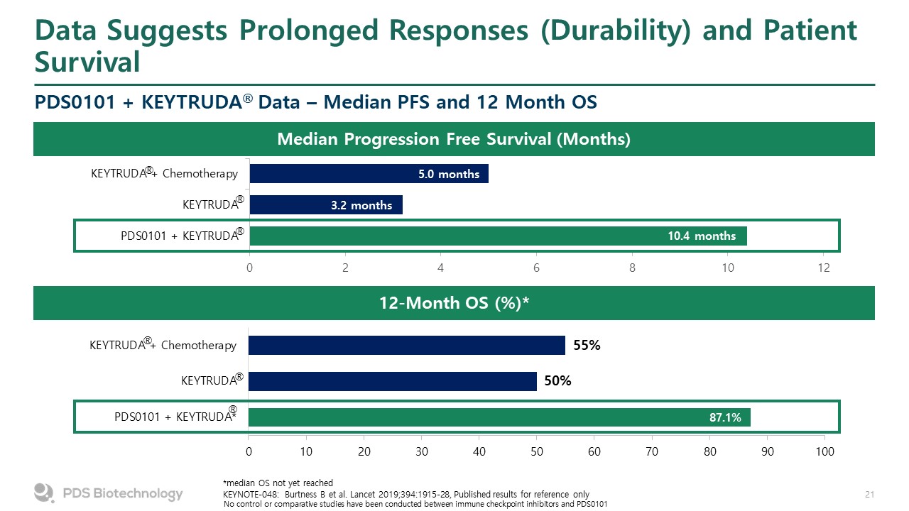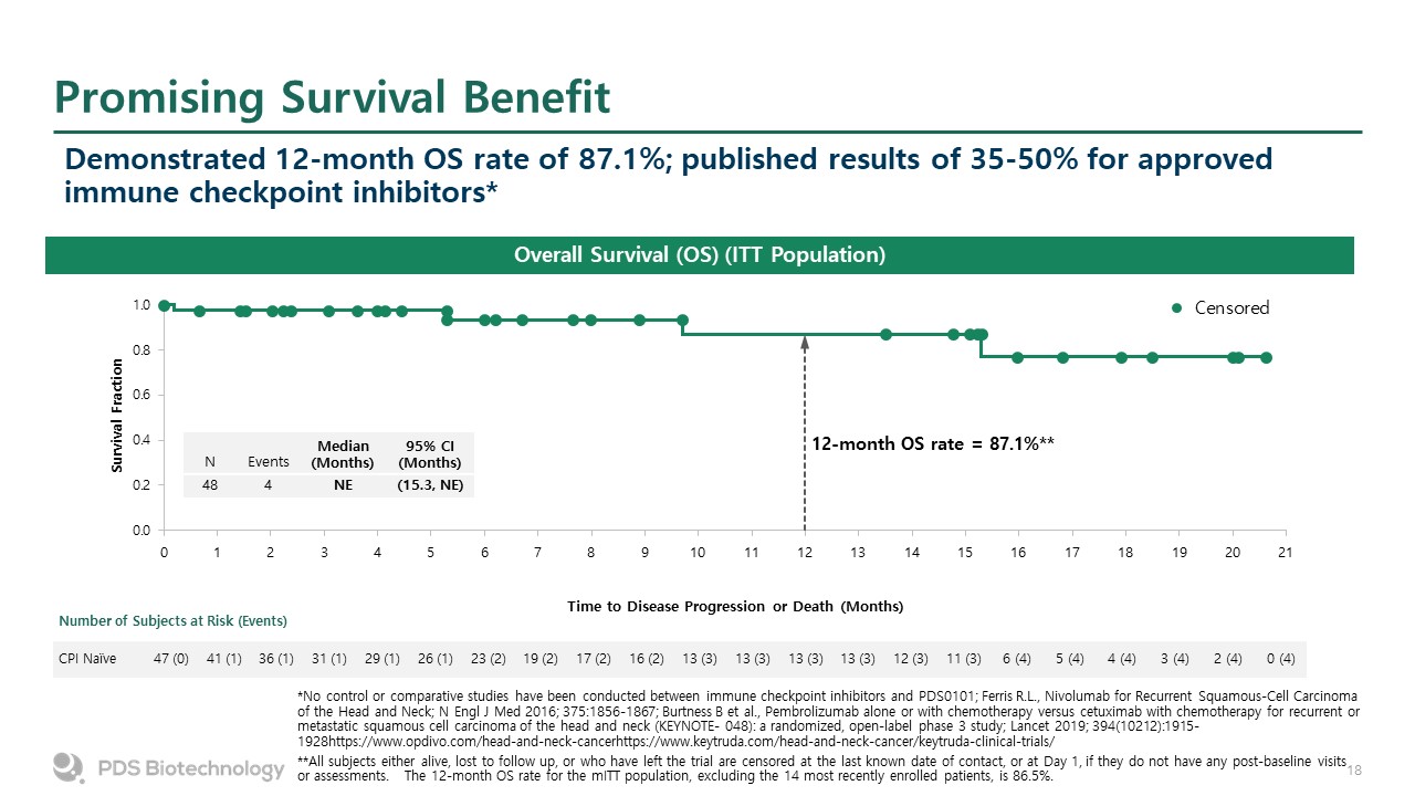 Promising Survival Benefit  Overall Survival (OS) (ITT Population)  Number of Subjects at Risk (Events)  CPI Naïve  47 (0)  41 (1)  36 (1)  31 (1)  29 (1)  26 (1)  23 (2)  19 (2)  17 (2)  16 (2)  13 (3)  13 (3)  13 (3)  13 (3)  12 (3)  11 (3)  6 (4)  5 (4)  4 (4)  3 (4)  2 (4)  0 (4)  N  Events  Median (Months)  95% CI(Months)  48  4  NE  (15.3, NE)  12-month OS rate = 87.1%**  Demonstrated 12-month OS rate of 87.1%; published results of 35-50% for approved immune checkpoint inhibitors*   *No control or comparative studies have been conducted between immune checkpoint inhibitors and PDS0101; Ferris R.L., Nivolumab for Recurrent Squamous-Cell Carcinoma of the Head and Neck; N Engl J Med 2016; 375:1856-1867; Burtness B et al., Pembrolizumab alone or with chemotherapy versus cetuximab with chemotherapy for recurrent or metastatic squamous cell carcinoma of the head and neck (KEYNOTE- 048): a randomized, open-label phase 3 study; Lancet 2019; 394(10212):1915-1928https://www.opdivo.com/head-and-neck-cancerhttps://www.keytruda.com/head-and-neck-cancer/keytruda-clinical-trials/  **All subjects either alive, lost to follow up, or who have left the trial are censored at the last known date of contact, or at Day 1, if they do not have any post-baseline visits or assessments. The 12-month OS rate for the mITT population, excluding the 14 most recently enrolled patients, is 86.5%.