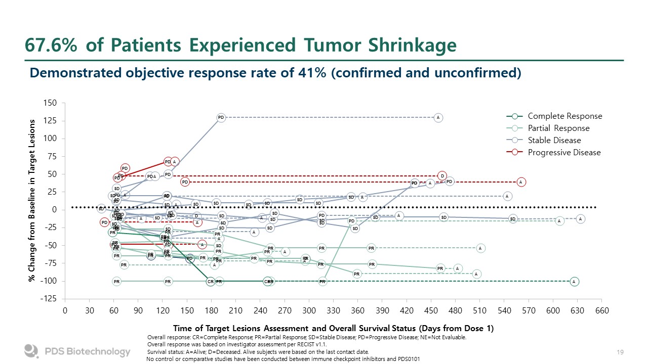 67.6% of Patients Experienced Tumor Shrinkage  Overall response: CR=Complete Response; PR=Partial Response; SD=Stable Disease; PD=Progressive Disease; NE=Not Evaluable.  Overall response was based on investigator assessment per RECIST v1.1.  Survival status: A=Alive; D=Deceased. Alive subjects were based on the last contact date.  Complete Response  Partial Response  Stable Disease  Progressive Disease  Demonstrated objective response rate of 41% (confirmed and unconfirmed)  No control or comparative studies have been conducted between immune checkpoint inhibitors and PDS0101