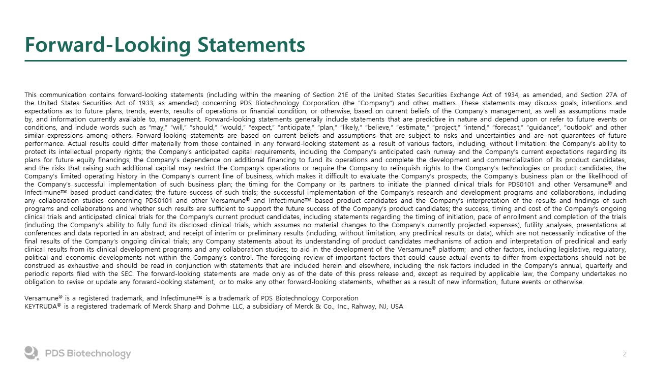 Forward-Looking Statements  This communication contains forward-looking statements (including within the meaning of Section 21E of the United States Securities Exchange Act of 1934, as amended, and Section 27A of the United States Securities Act of 1933, as amended) concerning PDS Biotechnology Corporation (the “Company”) and other matters. These statements may discuss goals, intentions and expectations as to future plans, trends, events, results of operations or financial condition, or otherwise, based on current beliefs of the Company’s management, as well as assumptions made by, and information currently available to, management. Forward-looking statements generally include statements that are predictive in nature and depend upon or refer to future events or conditions, and include words such as “may,” “will,” “should,” “would,” “expect,” “anticipate,” “plan,” “likely,” “believe,” “estimate,” “project,” “intend,” “forecast,” “guidance”, “outlook” and other similar expressions among others. Forward-looking statements are based on current beliefs and assumptions that are subject to risks and uncertainties and are not guarantees of future performance. Actual results could differ materially from those contained in any forward-looking statement as a result of various factors, including, without limitation: the Company’s ability to protect its intellectual property rights; the Company’s anticipated capital requirements, including the Company’s anticipated cash runway and the Company’s current expectations regarding its plans for future equity financings; the Company’s dependence on additional financing to fund its operations and complete the development and commercialization of its product candidates, and the risks that raising such additional capital may restrict the Company’s operations or require the Company to relinquish rights to the Company’s technologies or product candidates; the Company’s limited operating history in the Company’s current line of business, which makes it difficult to evaluate the Company’s prospects, the Company’s business plan or the likelihood of the Company’s successful implementation of such business plan; the timing for the Company or its partners to initiate the planned clinical trials for PDS0101 and other Versamune® and Infectimune™ based product candidates; the future success of such trials; the successful implementation of the Company’s research and development programs and collaborations, including any collaboration studies concerning PDS0101 and other Versamune® and Infectimune™ based product candidates and the Company’s interpretation of the results and findings of such programs and collaborations and whether such results are sufficient to support the future success of the Company’s product candidates; the success, timing and cost of the Company’s ongoing clinical trials and anticipated clinical trials for the Company’s current product candidates, including statements regarding the timing of initiation, pace of enrollment and completion of the trials (including the Company’s ability to fully fund its disclosed clinical trials, which assumes no material changes to the Company’s currently projected expenses), futility analyses, presentations at conferences and data reported in an abstract, and receipt of interim or preliminary results (including, without limitation, any preclinical results or data), which are not necessarily indicative of the final results of the Company’s ongoing clinical trials; any Company statements about its understanding of product candidates mechanisms of action and interpretation of preclinical and early clinical results from its clinical development programs and any collaboration studies; to aid in the development of the Versamune® platform;  and other factors, including legislative, regulatory, political and economic developments not within the Company’s control. The foregoing review of important factors that could cause actual events to differ from expectations should not be construed as exhaustive and should be read in conjunction with statements that are included herein and elsewhere, including the risk factors included in the Company’s annual, quarterly and periodic reports filed with the SEC. The forward-looking statements are made only as of the date of this press release and, except as required by applicable law, the Company undertakes no obligation to revise or update any forward-looking statement, or to make any other forward-looking statements, whether as a result of new information, future events or otherwise.    Versamune® is a registered trademark, and Infectimune™ is a trademark of PDS Biotechnology Corporation  KEYTRUDA® is a registered trademark of Merck Sharp and Dohme LLC, a subsidiary of Merck & Co., Inc., Rahway, NJ, USA
