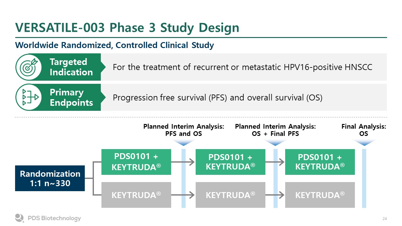 VERSATILE-003 Phase 3 Study Design  Worldwide Randomized, Controlled Clinical Study  Progression free survival (PFS) and overall survival (OS)  Primary Endpoints  For the treatment of recurrent or metastatic HPV16-positive HNSCC  Targeted Indication  Randomization 1:1 n~330  PDS0101 +KEYTRUDA®   PDS0101 + KEYTRUDA®   PDS0101 + KEYTRUDA®   KEYTRUDA®  KEYTRUDA®  KEYTRUDA®  Planned Interim Analysis: PFS and OS  Planned Interim Analysis: OS + Final PFS  Final Analysis:OS