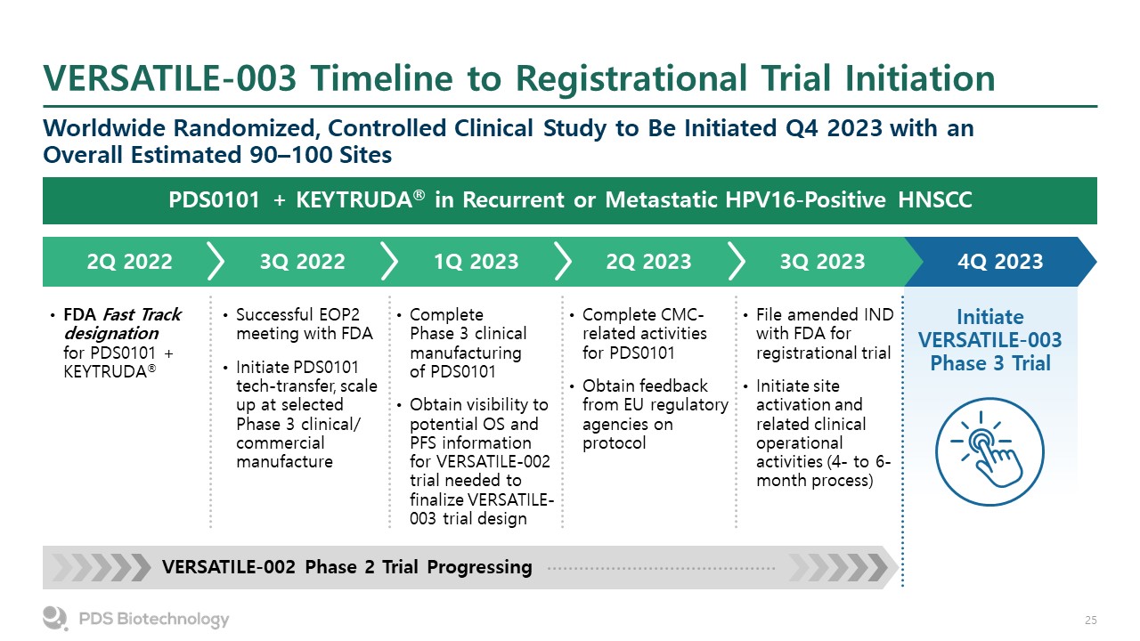 VERSATILE-003 Timeline to Registrational Trial Initiation  Worldwide Randomized, Controlled Clinical Study to Be Initiated Q4 2023 with an Overall Estimated 90–100 Sites  PDS0101 + KEYTRUDA® in Recurrent or Metastatic HPV16-Positive HNSCC  2Q 2022  3Q 2022  1Q 2023  2Q 2023  3Q 2023  4Q 2023  FDA Fast Track designation for PDS0101 + KEYTRUDA®  Successful EOP2 meeting with FDA  Initiate PDS0101 tech-transfer, scale up at selected Phase 3 clinical/commercial manufacture  Complete Phase 3 clinical manufacturing of PDS0101  Obtain visibility to potential OS and PFS information for VERSATILE-002 trial needed to finalize VERSATILE-003 trial design  Complete CMC-related activities for PDS0101  Obtain feedback from EU regulatory agencies on protocol  File amended IND with FDA for registrational trial  Initiate site activation and related clinical operational activities (4- to 6-month process)  InitiateVERSATILE-003 Phase 3 Trial  VERSATILE-002 Phase 2 Trial Progressing
