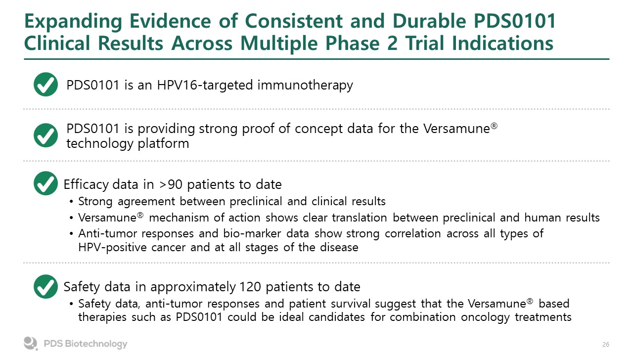Expanding Evidence of Consistent and Durable PDS0101 Clinical Results Across Multiple Phase 2 Trial Indications  PDS0101 is an HPV16-targeted immunotherapy  PDS0101 is providing strong proof of concept data for the Versamune® technology platform  Efficacy data in >90 patients to date  Strong agreement between preclinical and clinical results  Versamune® mechanism of action shows clear translation between preclinical and human results  Anti-tumor responses and bio-marker data show strong correlation across all types of HPV-positive cancer and at all stages of the disease  Safety data in approximately 120 patients to date  Safety data, anti-tumor responses and patient survival suggest that the Versamune® based therapies such as PDS0101 could be ideal candidates for combination oncology treatments