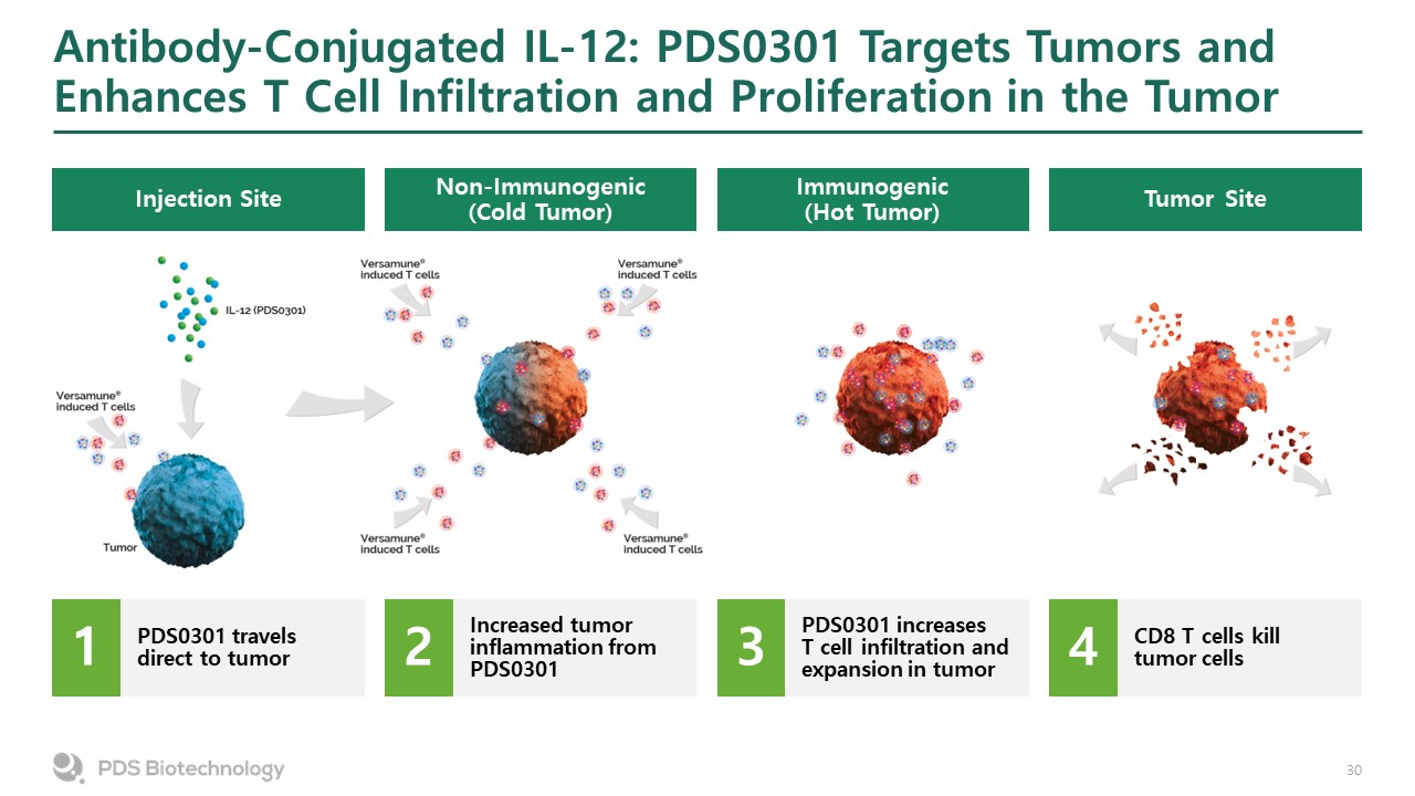 Antibody-Conjugated IL-12: PDS0301 Targets Tumors and Enhances T Cell Infiltration and Proliferation in the Tumor   Tumor Site  Injection Site  Non-Immunogenic (Cold Tumor)  Immunogenic (Hot Tumor)  Tumor Site  PDS0301 travels direct to tumor  Increased tumor inflammation from PDS0301  PDS0301 increases T cell infiltration and expansion in tumor  CD8 T cells kill tumor cells  1  2  3  4