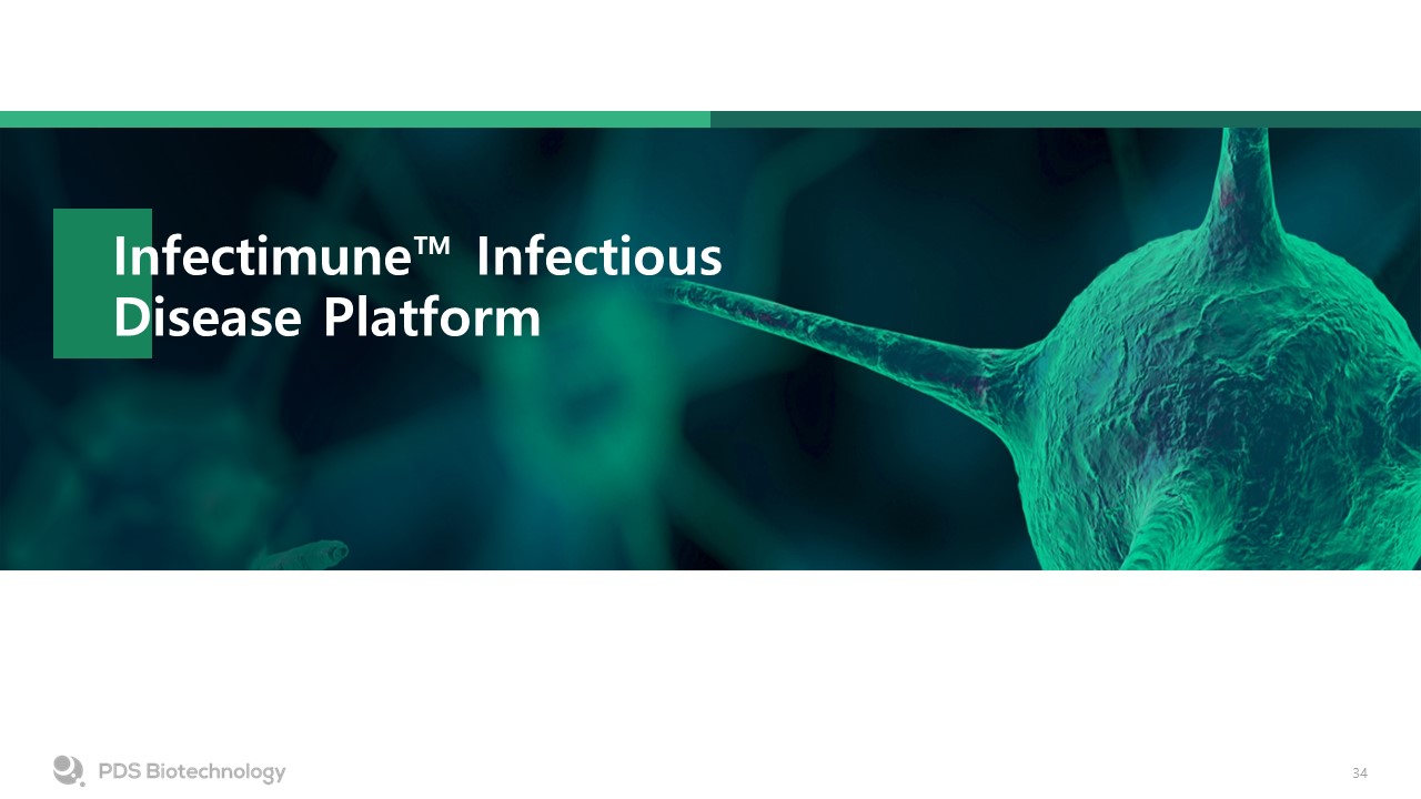 License agreement with University of Georgia for proprietary influenza antigens  Top-line preclinical data announced; effective delivery of flu proteins activate the critical immune signals necessary to generate neutralizing antibody responses to all flu strains tested in animals  Preclinical data presented at the 41st Annual meeting of the American Society Virology Meeting  Universal Flu Market Opportunity in 2021  PDS0202: Universal Prevention of Influenza   PDS0202 Provided Full Protection Against Lethal Challenge with H1N1 Pandemic Strain in Preclinical Study  Reference: Ross T. and Woodward J. et al. evaluation of the PDS0202 (Infectimune™+ COBRA) Universal flu formulation.   Proprietary Computationally Designed Influenza Protein  % survival  Day post infection  Universal Influenza Vaccines  $7 Billion