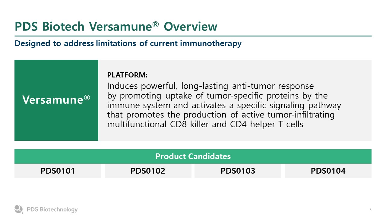 PDS Biotech Versamune® Overview  Designed to address limitations of current immunotherapy  PLATFORM:  Induces powerful, long-lasting anti-tumor response by promoting uptake of tumor-specific proteins by the immune system and activates a specific signaling pathway that promotes the production of active tumor-infiltrating multifunctional CD8 killer and CD4 helper T cells  Versamune®  PDS0101  PDS0102  PDS0103  PDS0104  Product Candidates