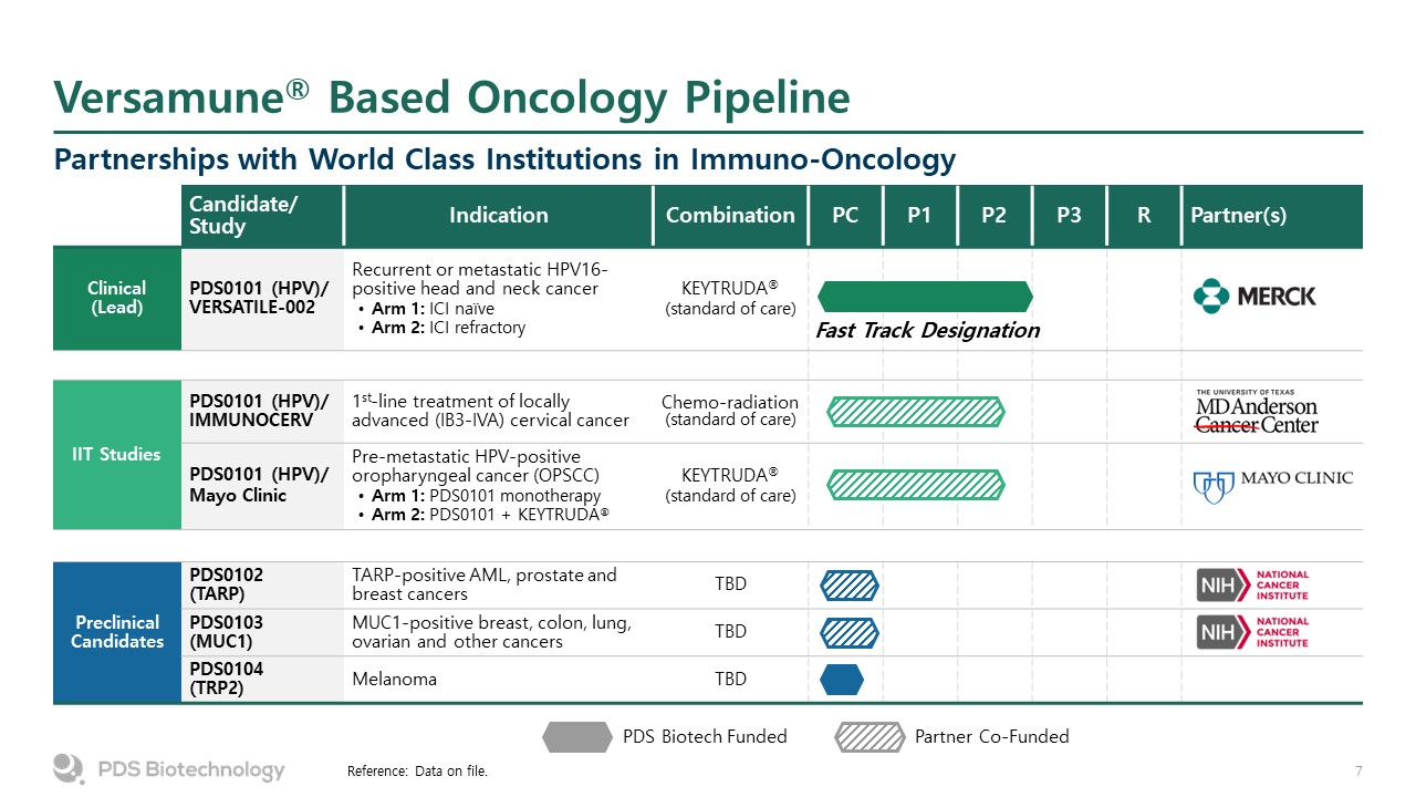 Versamune® Based Oncology Pipeline  Partnerships with World Class Institutions in Immuno-Oncology  Reference: Data on file.  PDS Biotech Funded  Candidate/ Study  Indication  Combination  PC  P1  P2  P3  R  Partner(s)  Clinical (Lead)  PDS0101 (HPV)/ VERSATILE-002  Recurrent or metastatic HPV16-positive head and neck cancer  Arm 1: ICI naïve   Arm 2: ICI refractory  KEYTRUDA®  (standard of care)  IIT Studies  PDS0101 (HPV)/ IMMUNOCERV  1st-line treatment of locally advanced (IB3-IVA) cervical cancer  Chemo-radiation (standard of care)  PDS0101 (HPV)/  Mayo Clinic  Pre-metastatic HPV-positive oropharyngeal cancer (OPSCC)  Arm 1: PDS0101 monotherapy  Arm 2: PDS0101 + KEYTRUDA®  KEYTRUDA®   (standard of care)  Preclinical Candidates  PDS0102(TARP)  TARP-positive AML, prostate and breast cancers  TBD  PDS0103 (MUC1)  MUC1-positive breast, colon, lung, ovarian and other cancers  TBD  PDS0104(TRP2)  Melanoma  TBD  Partner Co-Funded  Fast Track Designation