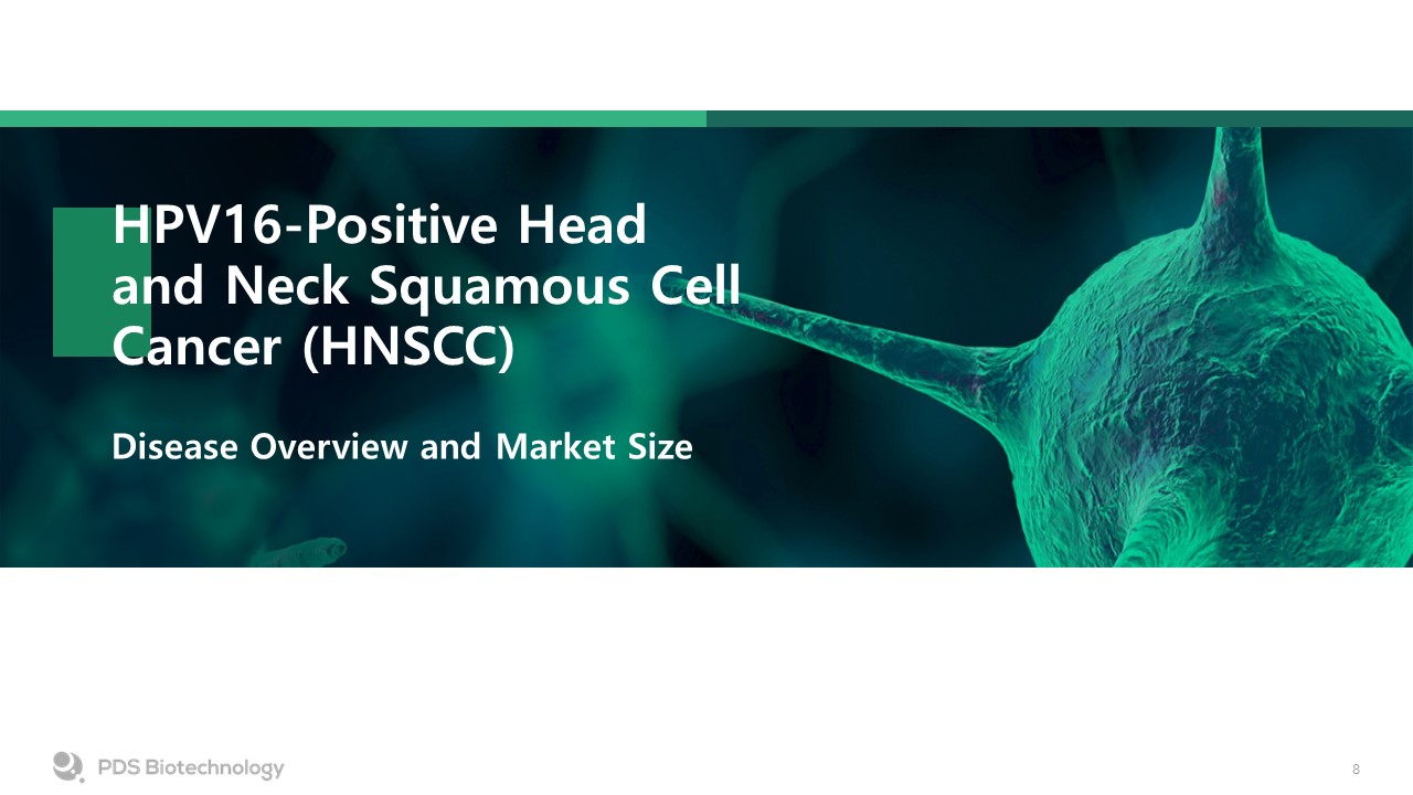 Targeted treatment option to address the growing population of HPV16-positive HNSCC and improve outcomes   Novel MOA that is clinically effective in a broader patient population and provides more durable responses.   Safer and more effective treatments that may be used with or in place of current standard of care   Better tolerability and less toxic alternatives to chemotherapy  Despite the Availability of Treatments, Significant Unmet Needs Remain in Recurrent or Metastatic HNSCC  KEYTRUDA®  KEYTRUDA® Plus Chemo  Chemotherapy   + EGFR Inhibitor  Objective Response Rate (ORR)  19%  36%  35%  Progression Free Survival (PFS)  3.2 mos  5.0 mos  5.0 mos  12-Month Survival Rate  50%  55%  44%  Median Overall Survival (OS)  12.3 mos  13.6 mos  10.3 mos  Key Toxicities  Anemia  Fatigue  Weight loss  Hypokalemia  Additional to KEYTRUDA®:   Neutropenia  Mucosal inflammation  Thrombocytopenia  Stomatitis  Neutropenia  Anemia   Thrombocytopenia  Nausea/vomiting  Hypokalemia  Rash  Fatigue   Mucosal inflammation  Treatment Related   Grade 3+ Toxicities  17%  72%  69%  Oncologist2 – Stated Unmet Medical Needs in HNSCC  Standard of Care for Recurrent or Metastatic HNSCC – Published Results*1  1KEYNOTE-048 Study  2Primary Market Research 2022  * No control or comparative studies have been conducted between immune checkpoint inhibitors and PDS0101