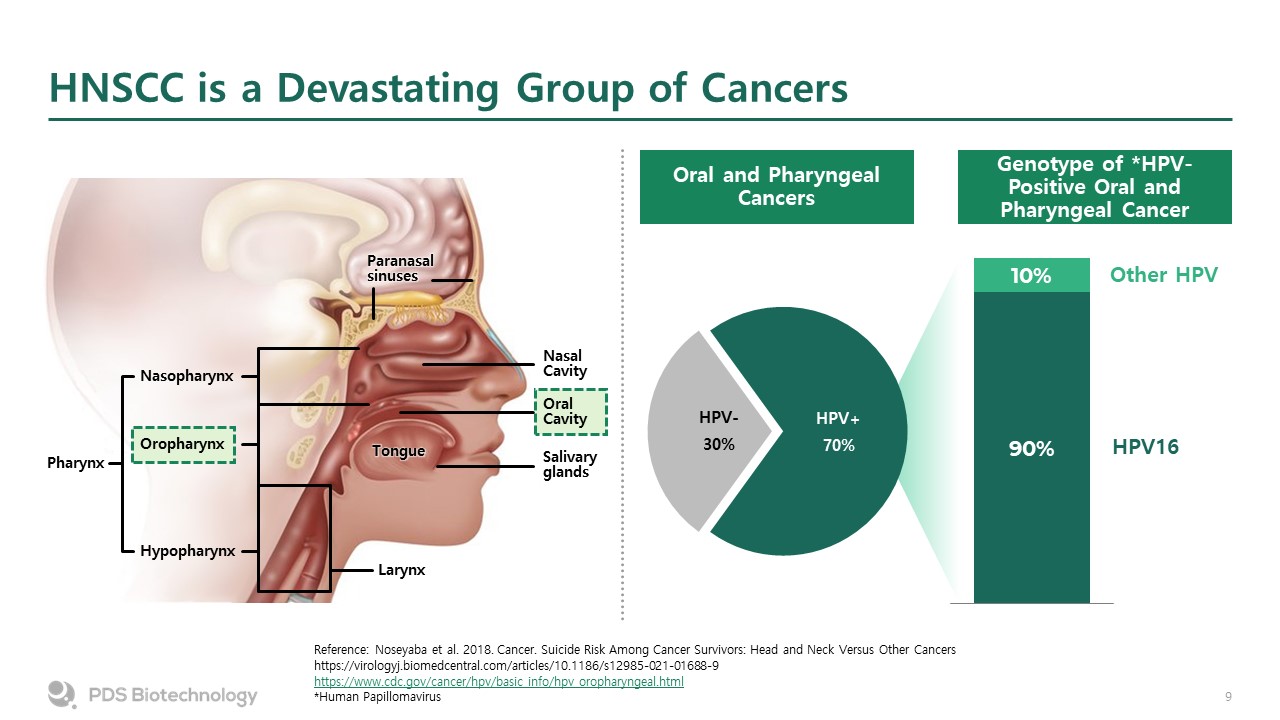 HNSCC is a Devastating Group of Cancers  Reference: Noseyaba et al. 2018. Cancer. Suicide Risk Among Cancer Survivors: Head and Neck Versus Other Cancers  https://virologyj.biomedcentral.com/articles/10.1186/s12985-021-01688-9  https://www.cdc.gov/cancer/hpv/basic_info/hpv_oropharyngeal.html  *Human Papillomavirus  Oral and PharyngealCancers  Genotype of *HPV-Positive Oral and Pharyngeal Cancer  Paranasalsinuses  Nasopharynx  Oropharynx  Hypopharynx  Larynx  Pharynx  Tongue  Salivaryglands  OralCavity  NasalCavity