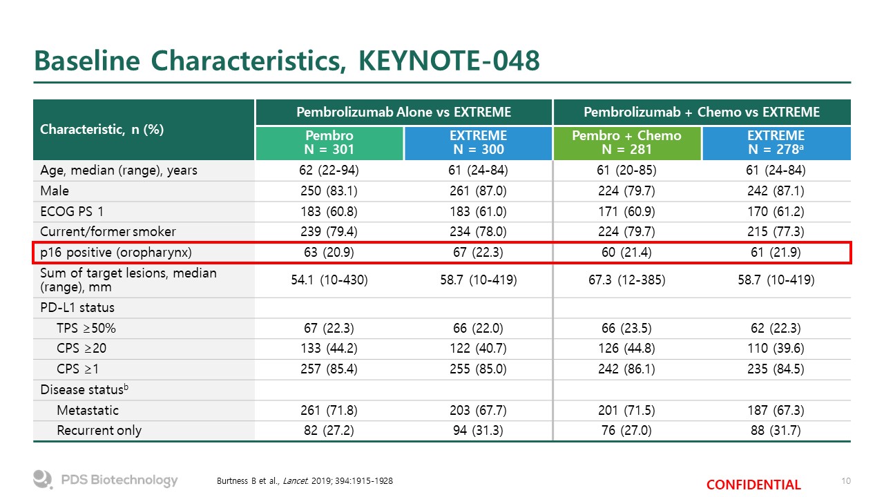 Baseline Characteristics, KEYNOTE-048  Burtness B et al., Lancet. 2019; 394:1915-1928  Characteristic, n (%)  Pembrolizumab Alone vs EXTREME  Pembrolizumab + Chemo vs EXTREME  Characteristic, n (%)  Pembro  N = 301  EXTREME  N = 300  Pembro + Chemo  N = 281  EXTREME  N = 278a  Age, median (range), years  62 (22-94)  61 (24-84)  61 (20-85)  61 (24-84)  Male  250 (83.1)  261 (87.0)  224 (79.7)  242 (87.1)  ECOG PS 1  183 (60.8)  183 (61.0)  171 (60.9)  170 (61.2)  Current/former smoker  239 (79.4)  234 (78.0)  224 (79.7)  215 (77.3)  p16 positive (oropharynx)  63 (20.9)  67 (22.3)  60 (21.4)  61 (21.9)  Sum of target lesions, median (range), mm  54.1 (10-430)  58.7 (10-419)  67.3 (12-385)  58.7 (10-419)  PD-L1 status  TPS ≥50%  67 (22.3)  66 (22.0)  66 (23.5)  62 (22.3)  CPS ≥20  133 (44.2)  122 (40.7)  126 (44.8)  110 (39.6)  CPS ≥1  257 (85.4)  255 (85.0)  242 (86.1)  235 (84.5)  Disease statusb  Metastatic  261 (71.8)  203 (67.7)  201 (71.5)  187 (67.3)  Recurrent only  82 (27.2)  94 (31.3)  76 (27.0)  88 (31.7)
