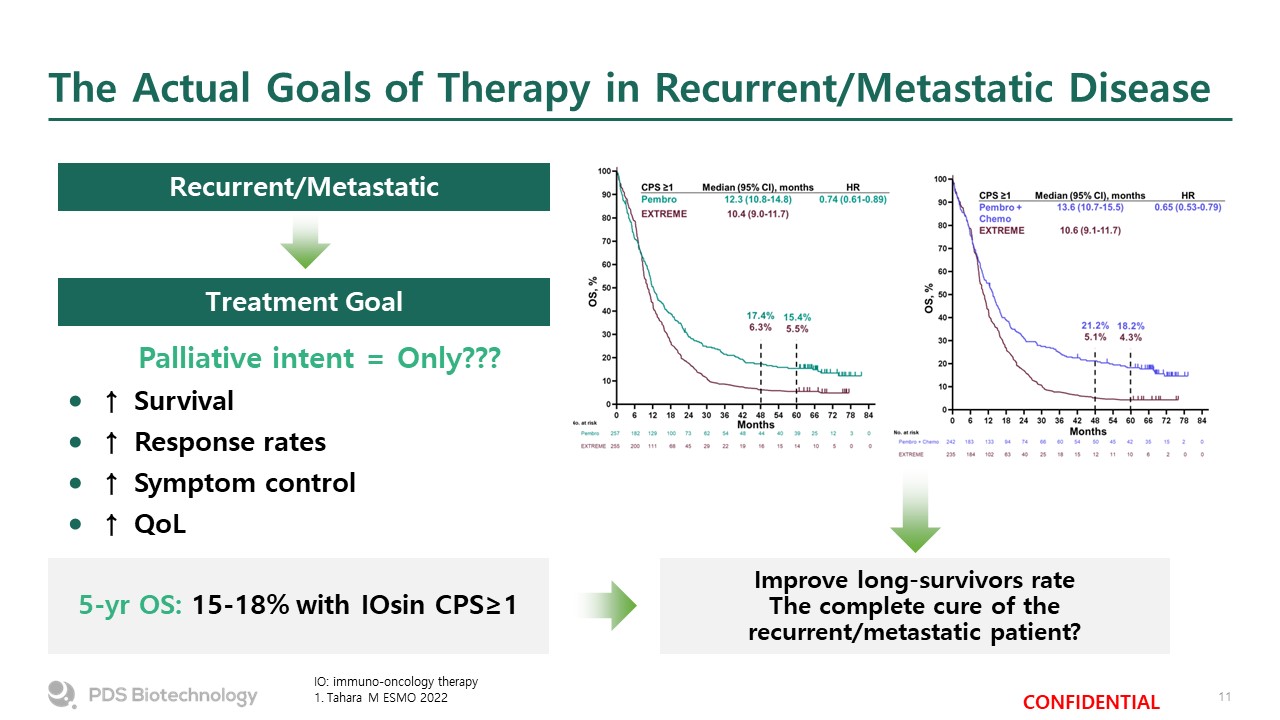 The Actual Goals of Therapy in Recurrent/Metastatic Disease  IO: immuno-oncology therapy  1. Tahara M ESMO 2022  Treatment Goal  5-yr OS: 15-18% with IOsin CPS≥1  Recurrent/Metastatic  Improve long-survivors rate The complete cure of the recurrent/metastatic patient?  Palliative intent = Only???  ↑ Survival  ↑ Response rates  ↑ Symptom control  ↑ QoL