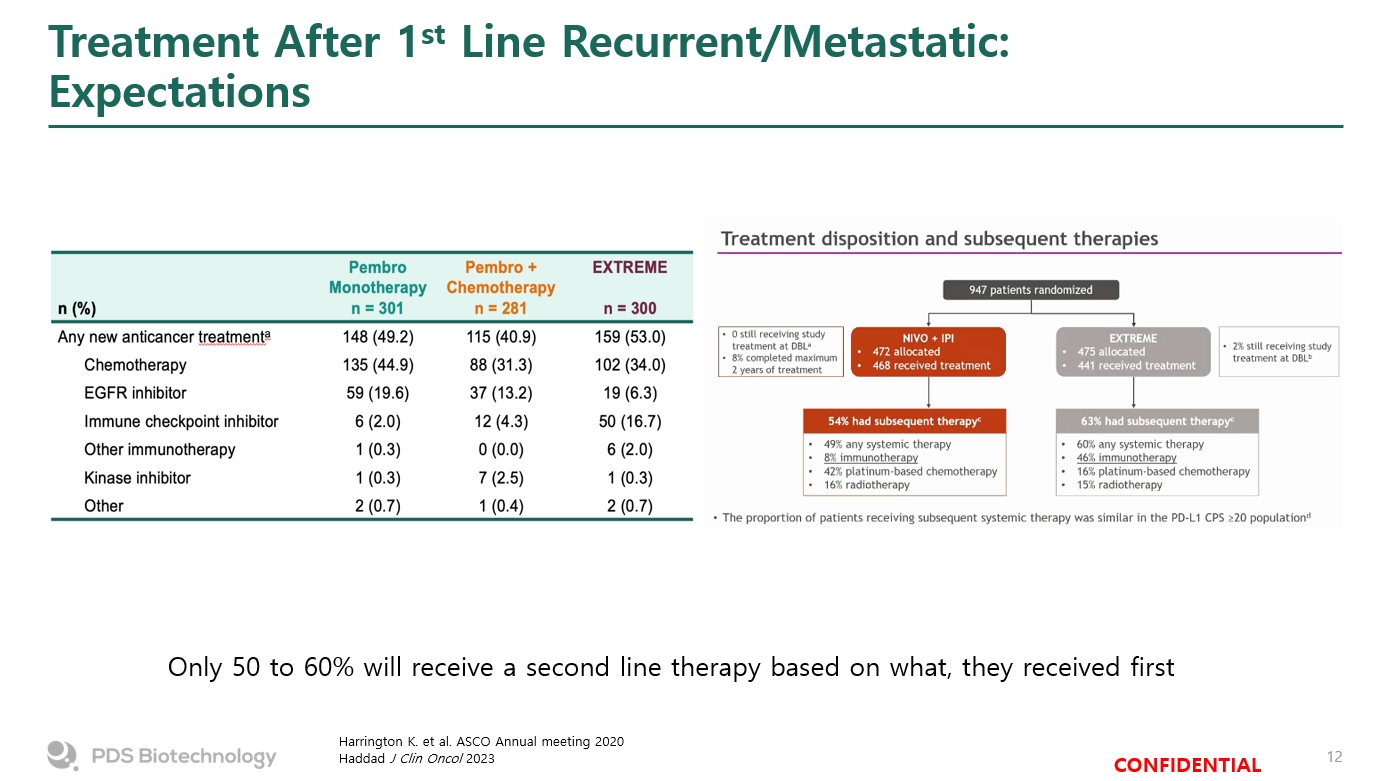 Treatment After 1st Line Recurrent/Metastatic: Expectations  Harrington K. et al. ASCO Annual meeting 2020  Haddad J Clin Oncol 2023  Only 50 to 60% will receive a second line therapy based on what, they received first