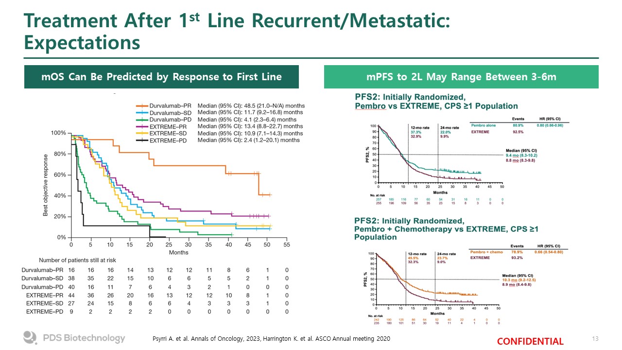 Treatment After 1st Line Recurrent/Metastatic: Expectations  Psyrri A. et al. Annals of Oncology, 2023, Harrington K. et al. ASCO Annual meeting 2020  mOS Can Be Predicted by Response to First Line  mPFS to 2L May Range Between 3-6m