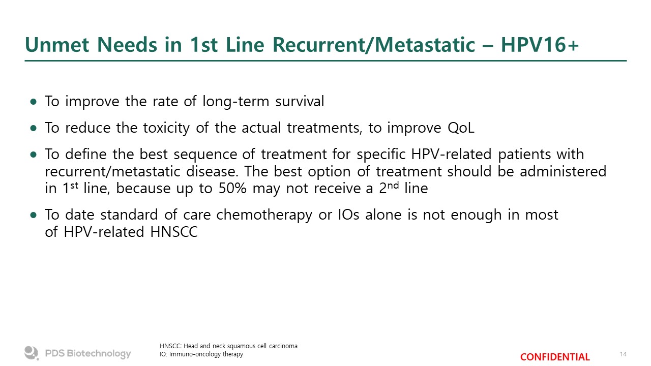 Unmet Needs in 1st Line Recurrent/Metastatic – HPV16+  HNSCC: Head and neck squamous cell carcinoma  IO: Immuno-oncology therapy  To improve the rate of long-term survival  To reduce the toxicity of the actual treatments, to improve QoL  To define the best sequence of treatment for specific HPV-related patients with recurrent/metastatic disease. The best option of treatment should be administered in 1st line, because up to 50% may not receive a 2nd line  To date standard of care chemotherapy or IOs alone is not enough in most of HPV-related HNSCC