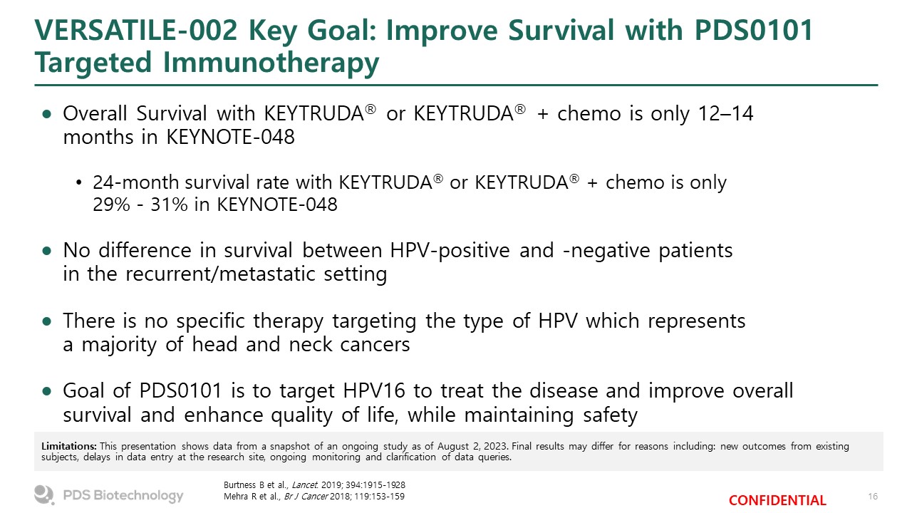 VERSATILE-002 Key Goal: Improve Survival with PDS0101 Targeted Immunotherapy  Burtness B et al., Lancet. 2019; 394:1915-1928  Mehra R et al., Br J Cancer 2018; 119:153-159  Overall Survival with KEYTRUDA® or KEYTRUDA® + chemo is only 12–14 months in KEYNOTE-048  24-month survival rate with KEYTRUDA® or KEYTRUDA® + chemo is only 29% - 31% in KEYNOTE-048  No difference in survival between HPV-positive and -negative patients in the recurrent/metastatic setting  There is no specific therapy targeting the type of HPV which represents a majority of head and neck cancers  Goal of PDS0101 is to target HPV16 to treat the disease and improve overall survival and enhance quality of life, while maintaining safety  Limitations: This presentation shows data from a snapshot of an ongoing study as of August 2, 2023. Final results may differ for reasons including: new outcomes from existing subjects, delays in data entry at the research site, ongoing monitoring and clarification of data queries.